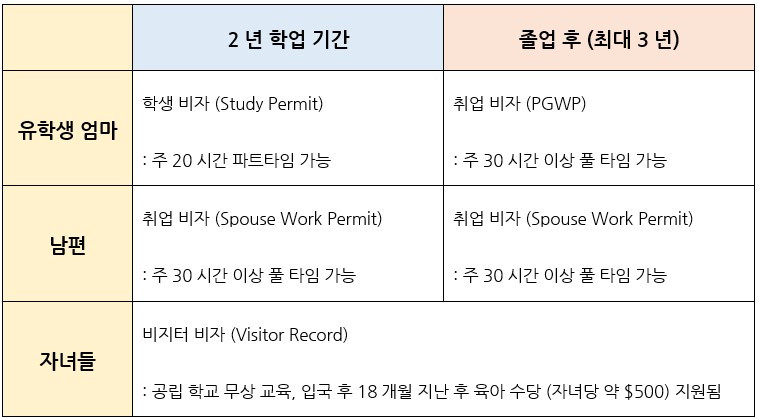 자녀가 있고 한국에서 직장생활을 하던 중·장년층의 사람들은 대부분 취업을 먼저 생각합니다. 먹고살고, 자녀를 양육하기 위해 돈을 벌어야 한다고 생각하기 때문에 한국에서 많은 돈을 짊어지고 갈 게 아니라면 당연히 취업을 해서 영주권을 받고 안전하게 삶을 정착하길 원해요. 바로 이민을 결심한 사람이라면 더욱더 그렇겠지요. 저의 경우에는 확실히 이민을 가겠다는 결심이 아직 선 것이 아니라서, 한 번 가족들이 다 같이 살아보면서 결정하면 어떨까 하는 마음이 컸기 때문에 유학 쪽으로 마음이 기울었었어요. 캐나다의 경우 부모 중 한 사람이 유학을 하면, 유학 생활 동안 자녀의 공립학교 학비가 무상이고 학생인 부모의 배우자에게는 어디서든 어떤 업종이든 일을 할 수 있는 취업 비자 (Open Work Permit)가 나오기 때문에 제가 원하는 방향에 부합되는 조건들이었어요. 참고로, 저 무상교육과 배우자 취업 비자는 유학 후 졸업하는 시점에 최대 3년까지 부모 모두에게 주어지기 때문에 자녀는 최대 5년간 무상 교육이 가능한 거죠. 이런 이유로, 일부에서는 엄마들이 중고생 자녀들만 데리고 캐나다에 와서 무난한 교과과정의 컬리지를 다니면서 아이들 유학 생활을 하고 가시는 분들도 있어요. 왜 아빠는 한국에서 기러기생활을 하며 생활비를 부쳐주고 엄마와 아이들이 5년 가까이 떨어져 지내며 굳이 이렇게 생활하는지 처음에는 이해하지 못했지만, 캐나다에 와서 생활하면서 아이들의 해외 유학과 미국 대학 진학을 위해 중고등학생 자녀를 둔 부모들의 큰 결단이라는 걸 알게 되었어요. 자녀의 미래를 위해 우리 부모님들은 모든 걸 희생할 준비가 되어있는 사람들이라는 걸 한 사람의 아버지로서 저 또한 느끼지만, 만약 나에게 그런 기러기 생활을 하라고 누가 제안하거나 혹은 그렇게 해야만 하는 상황이 온다면 과연 나는 그렇게 할 수 있을까라는 질문에 당당하게 답할 수는 없는 것 같아요. 그래서 우리 가족은 항상 함께 하자라는 마음으로 유학에 우선 마음이 기울었던 것 같아요. 이 경우에 주어지는 비자 조건에 대해서는 알기 쉽게 아래 예시를 드릴게요.