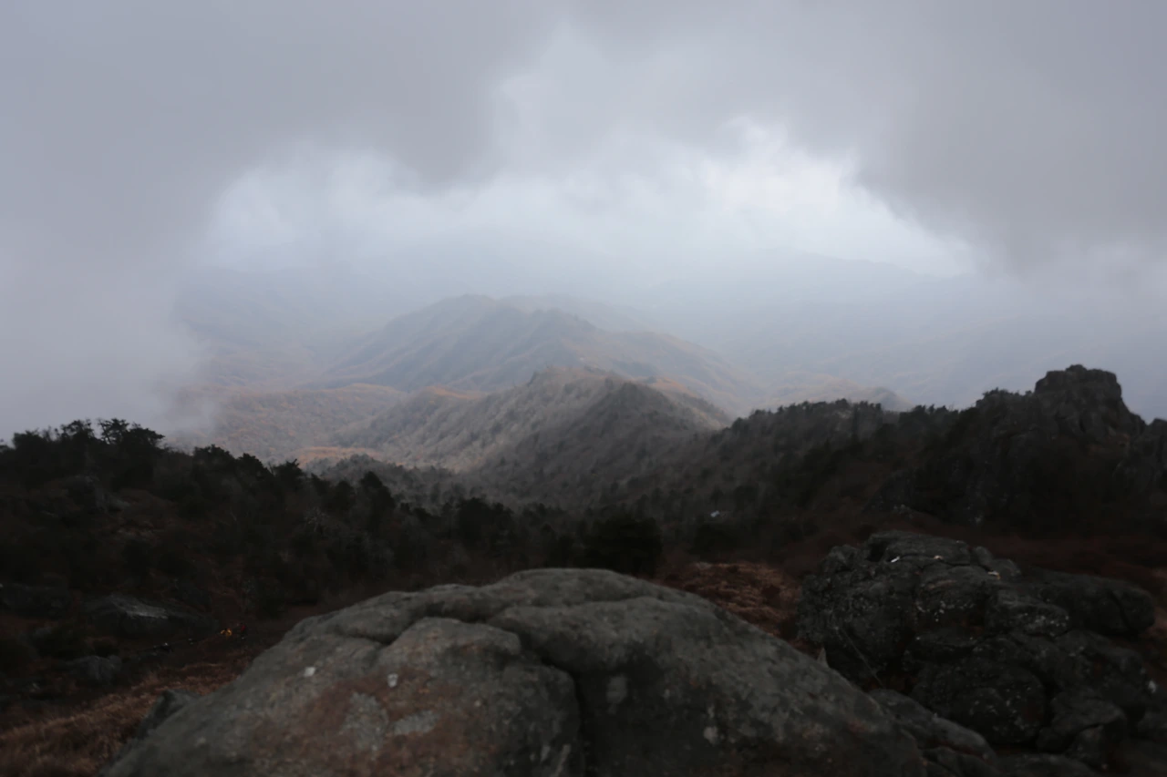 산등선에서 간혹 보여주는 장관은 무거워진 발걸음에 힘을 실어준다. 높이 오를수록 구름이 낮아지고 있다.
