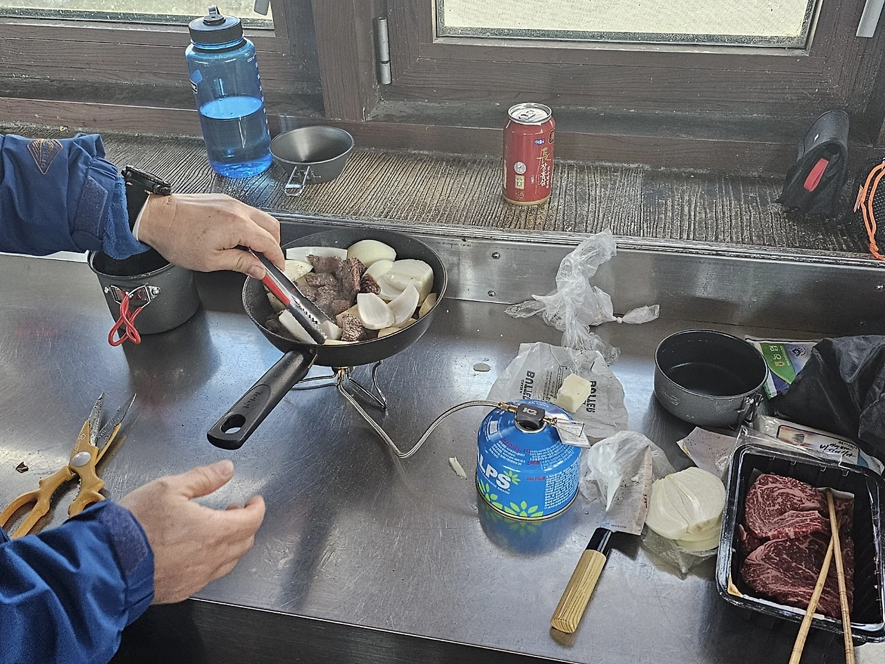 20kg 짊어지고 온 노고가 한순간 보상받는 순간이다. 제수씨까지 동원해서 정성스럽게 준비한 한상차림이다. 투뿔한우등심에 감자, 양파까지 혹시나 모자랄까 버너가스 두통, 라면 끓일 물까지 따로 준비한 친구의 마음이 고스란히 전해온다.