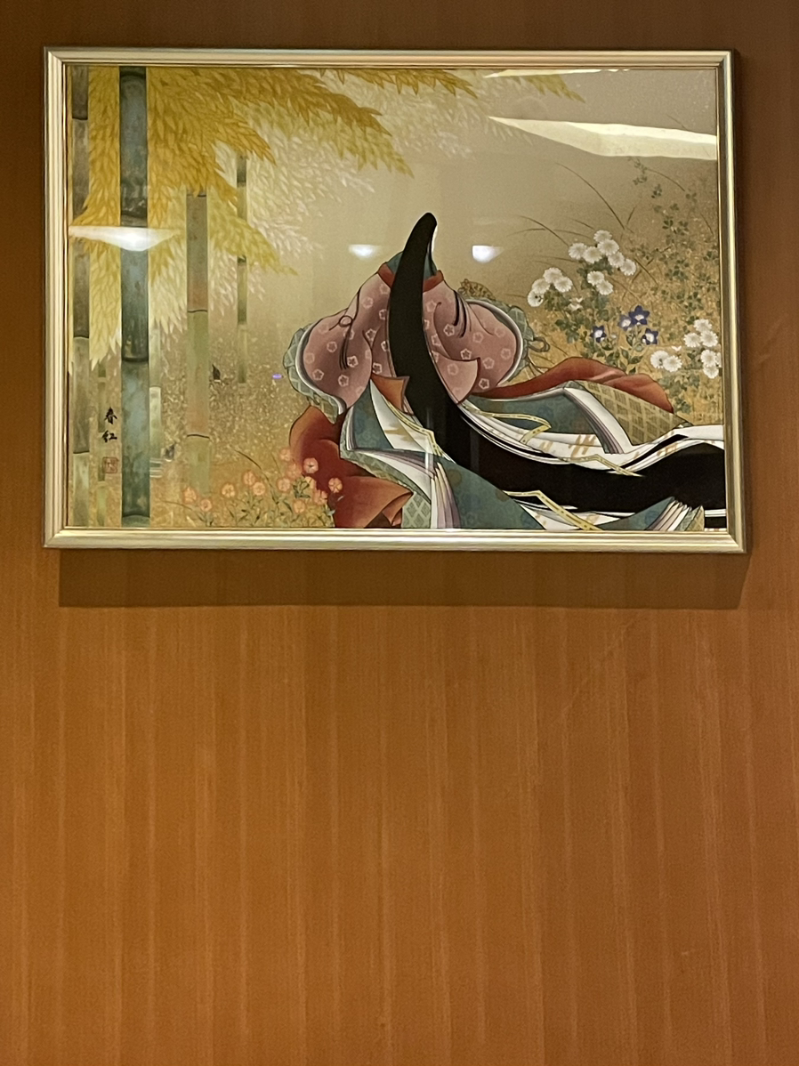 구글맵을 보면서 찾아간 료칸은 다케테리토리마루야마, 대나무숲을 차지한 정자라는 이름이 잘 어울린다. 막 들어선 입구 한쪽면에 걸려있는 독특한 일본화가 시선을 사로잡아 한동안 자리를 뜨지 못하였다. 대나무숲 사이로 불어오는 바람에 흩날리는 꽃잎들과 미끄러지듯 길게 머리채를 날리는 여인의 뒷모습이 멋지게 어우러져 아주 매혹적으로 표현된 작품이다. 아마도 유명한 역사적 사건이나 소설적 이야기를 그림으로 풀어낸 것이리라.