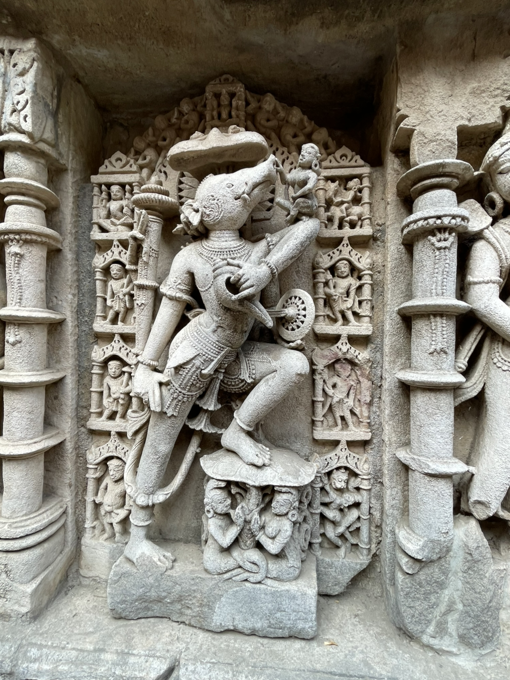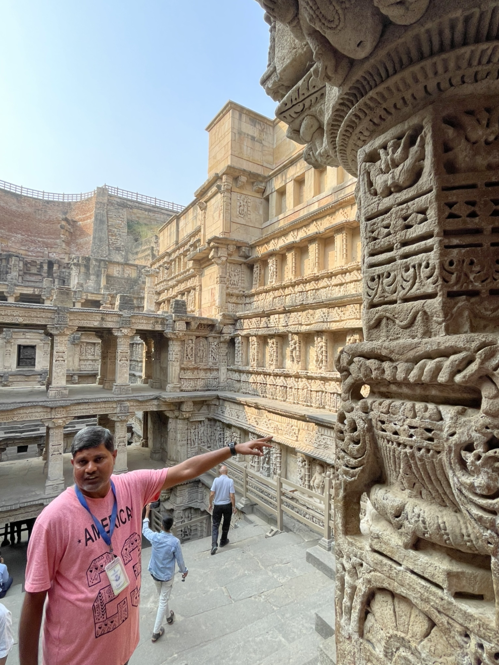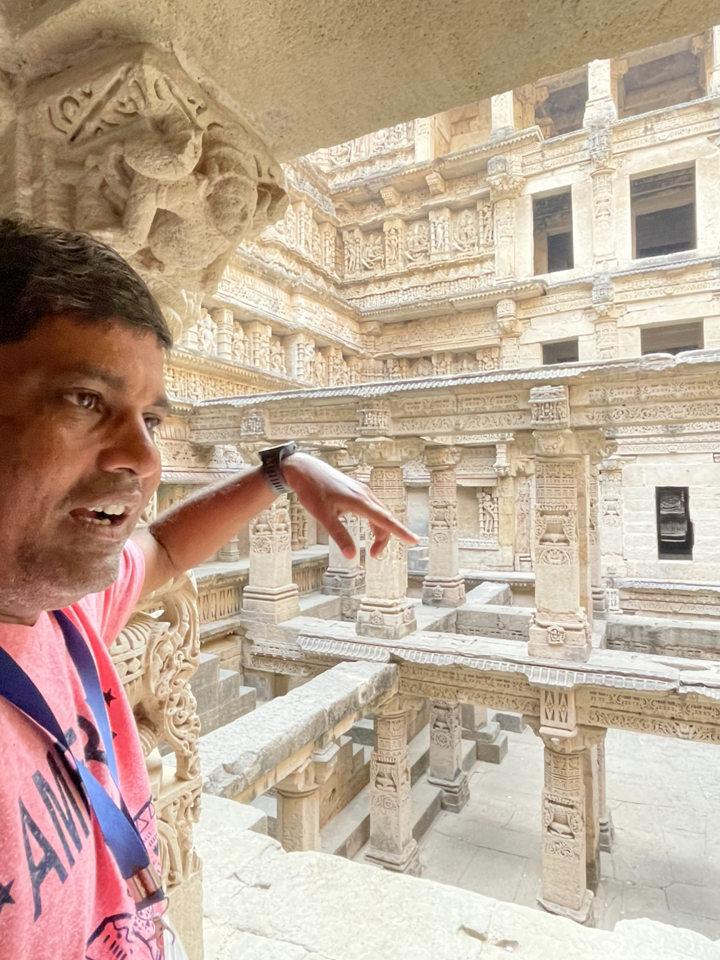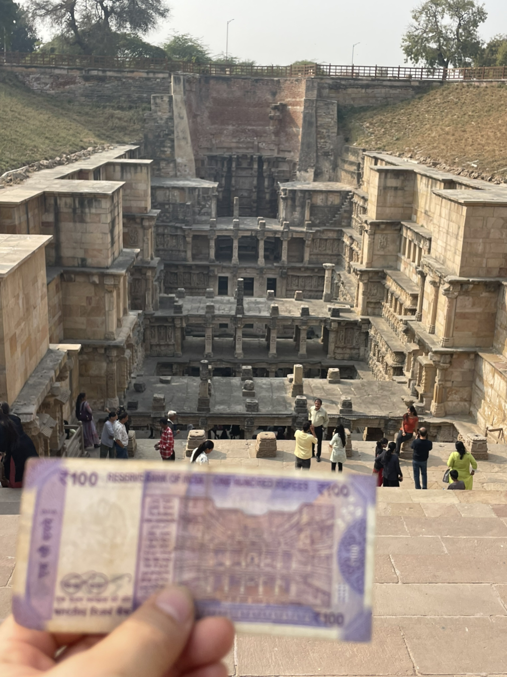 드디어 도착한 곳은 파탄에 있는 인도 100루피 지폐 뒷면에 인쇄된 Rani ki vav 왕비의 계단식 우물이다. 인당 500루피 입장료를 내고, 입구에서 영어가이드에게 700루피를 지불하기로 하고 함께 입장하였다. 강한 인도식 영어발음에 채 20% 정도나 알아 들었을까? 반복되는 힌두 이름에 어지러울 지경이었지만 끝까지 들어보기로 했다.