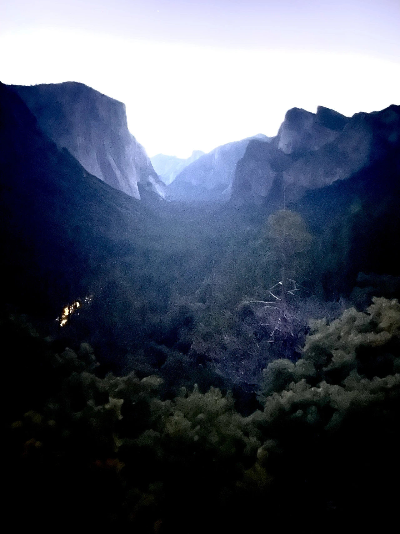 해뜨는 Tunnel view point. 양쪽으로 엘캐피탄과 하프돔(Half Dome)이 마주보고 있다.어둠이 갈라지며 빛이 솓아나는 장관이다.