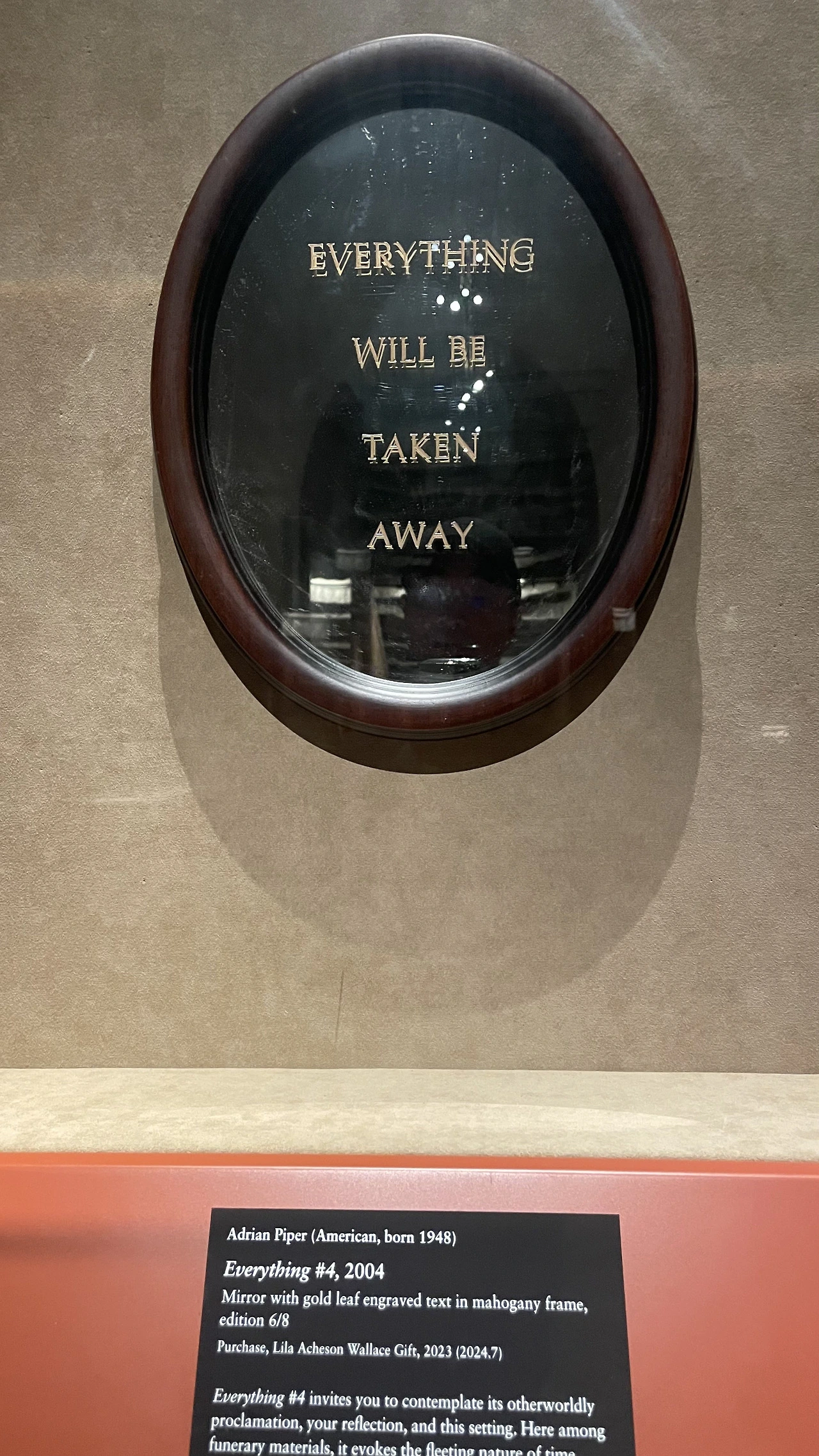 관람을 마치고 돌아서는 길에도 요가수행자이자 콘셉트미술가인 에이드리언 파이퍼(Adrian Piper)의 거울에 비친 “Everything will be taken away(모든 것은 사라질 것이다 / 빼앗길 것이다)” 작품이 잔잔한 여운을 남긴다.