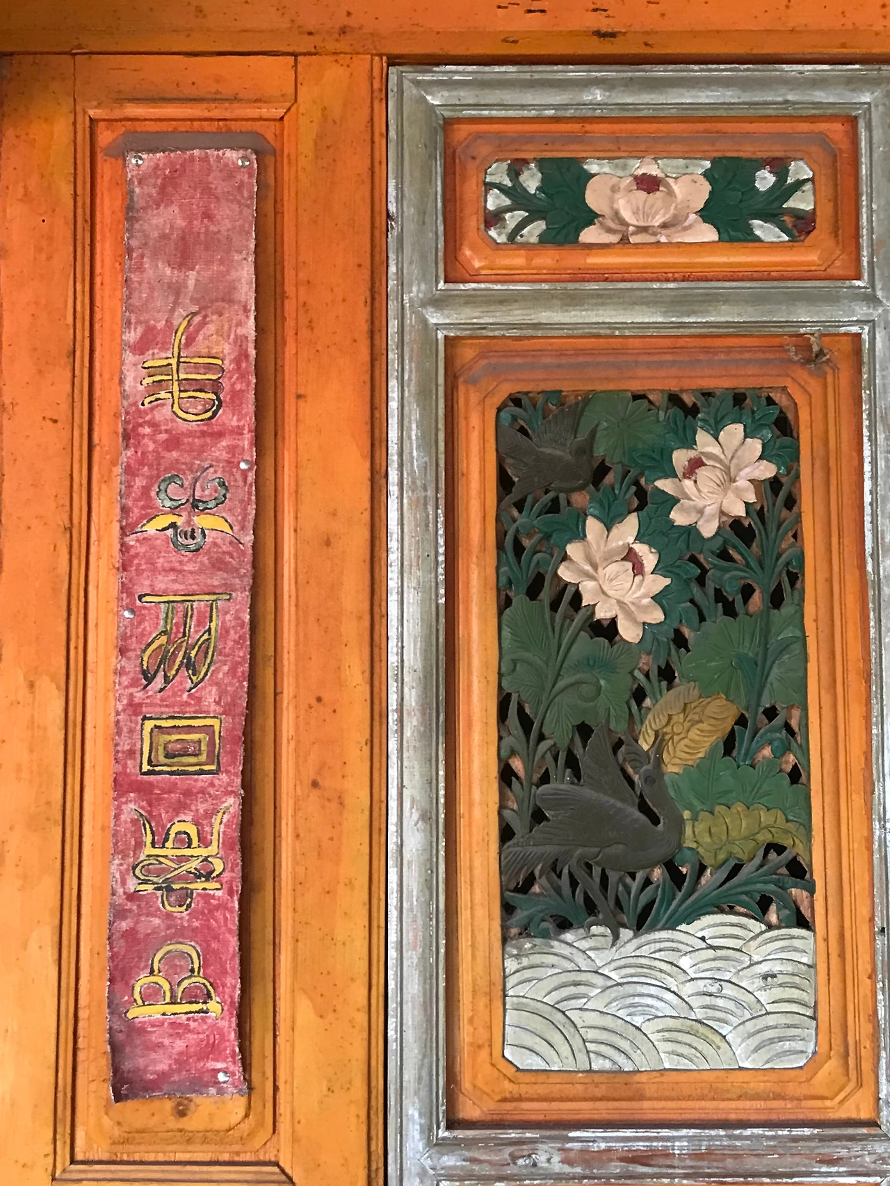 옅은 오렌지 색상의 바탕에 과감한 흰색 테두리와 바다 물결, 거칠게 칠해진 붉은 벽돌색 위에 그려진 노란색 상형문자, 익숙한 연꽃무늬, 초록과 연분홍의 조화는 우리에겐 낯선 색감이지만 이들에겐 무척 친근한 전통적 색감이리라. 모든 것이 세련되게 다듬어져 있지는 않지만 원초적 힘이 넘친다. 토속화의 매력이다.