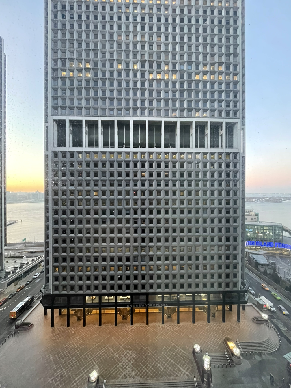 숙소에서 마주 보이는 One New York Plaza는 오피스용으로 1970년에 오픈한 건물인데, 2014년에 리모델링을 했다고 한다. 지하상가엔 Starbucks 등 커피숍과 작은 상점들이 있다. 벌집 같은 반복적인 정방형 창문모양이 묘한 매력으로 시선을 사로잡는다. 대표적인 모더니즘 건축양식이다. 금융가에 자리 잡아서인지 밤늦도록 불이 켜져 있다.