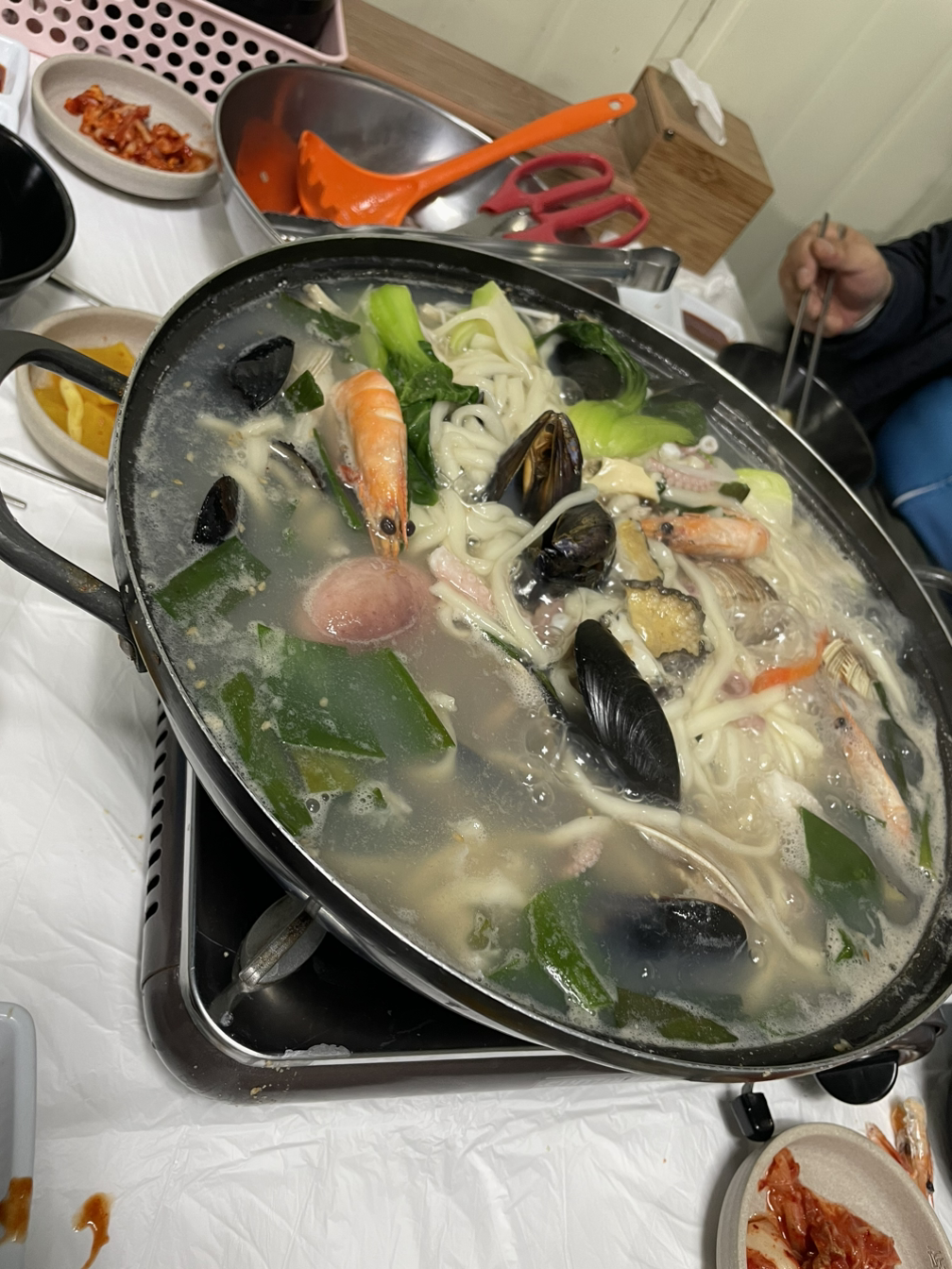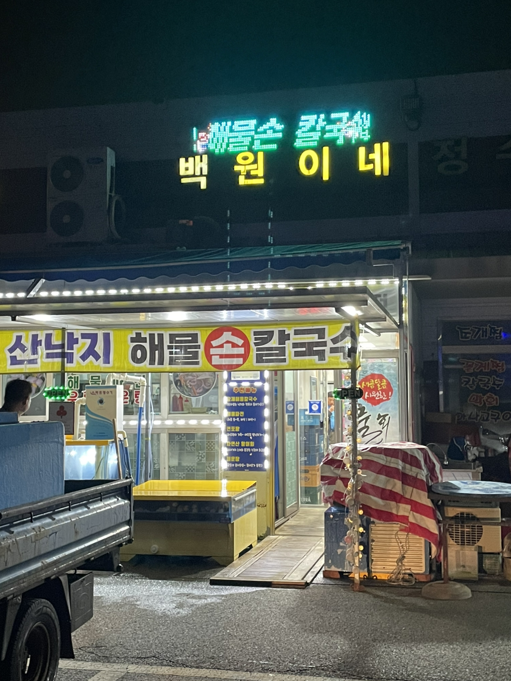 구청도움으로 해변을 매립하여 현지 어촌계들이 마련한 식당가라고 한다. 친구가 자주 가던 맛집은 화재로 사라지고 유일하게 남은 백원이네 맛집을 찾았다. 건설업을 하다가 9년 전부터 식당을 운영하신다는 사장님은 바지락 없는 해물칼국수의 원재료관리와 수년간 연구 끝에 완성한 해물파전레시피에 굉장한 자부심을 갖고 계시다. 자신이 하는 일에 진정성을 갖고 계신 분들을 뵈면 기분이 좋아진다.