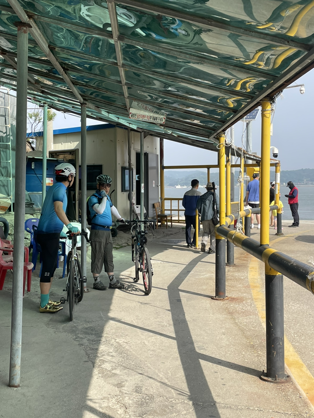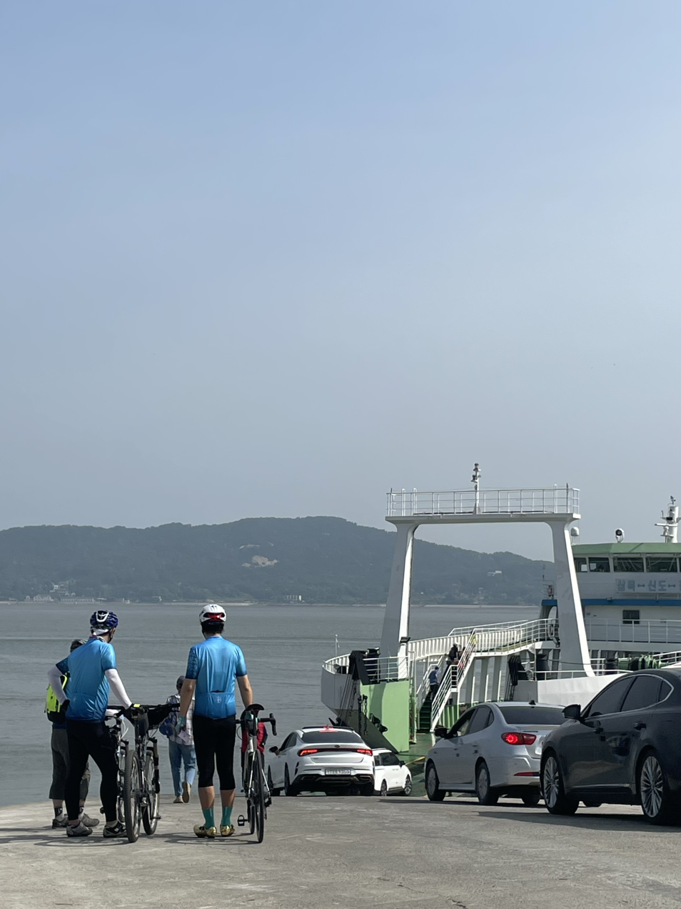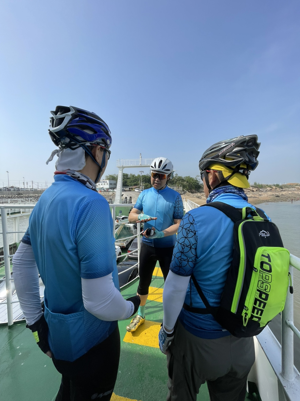 매 30분 간격으로 두 개의 선박회사가 운영하는 10분이 채 안 되는 배편이었지만 그 짧은 시간에도 우리의 캡틴은 지난번에 이어 둔근페달링에 대한 세세한 설명을 전한다. 신도항에 도착하자 둔근페달링에 적합한 클릭위치 및 안장위치를 조정하고 개별적으로 라이딩 자세를 코칭한다. 지난번 멤버들 모두 그 효과를 경험했던 터라 새로운 페달링에 맞춰 적극적으로 피팅을 하였다. 새로운 기술을 배웠으니 이제 써먹어 봐야지.