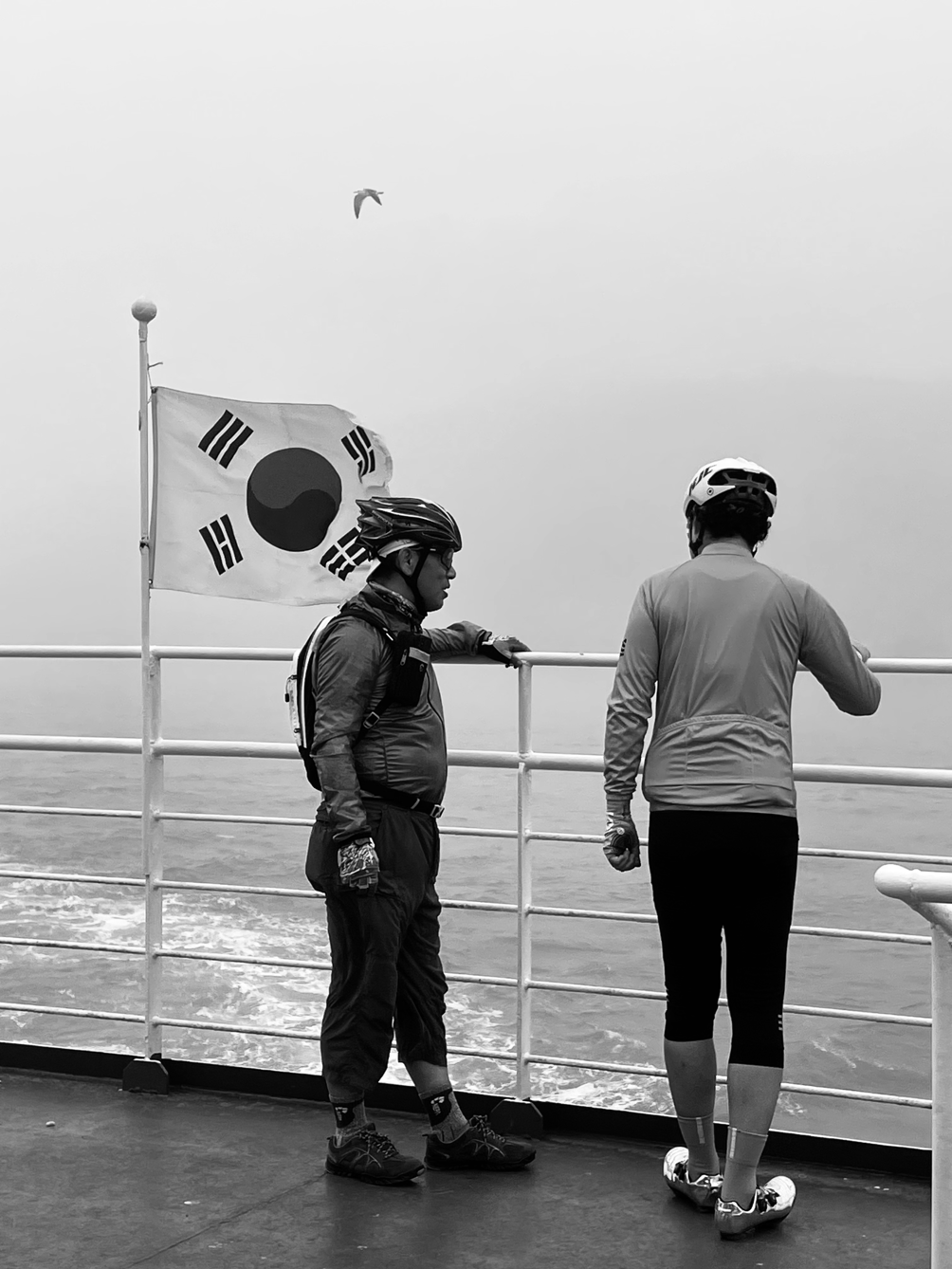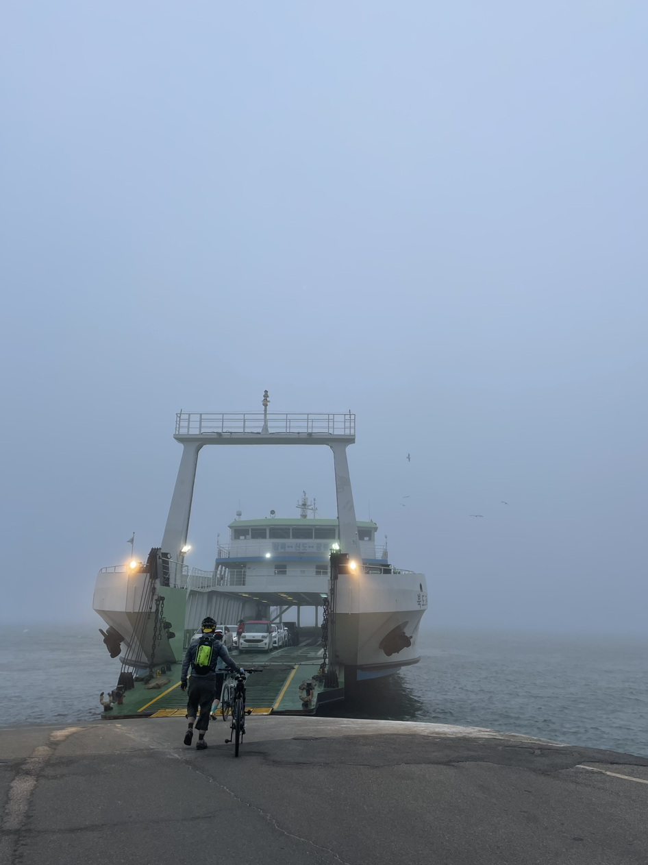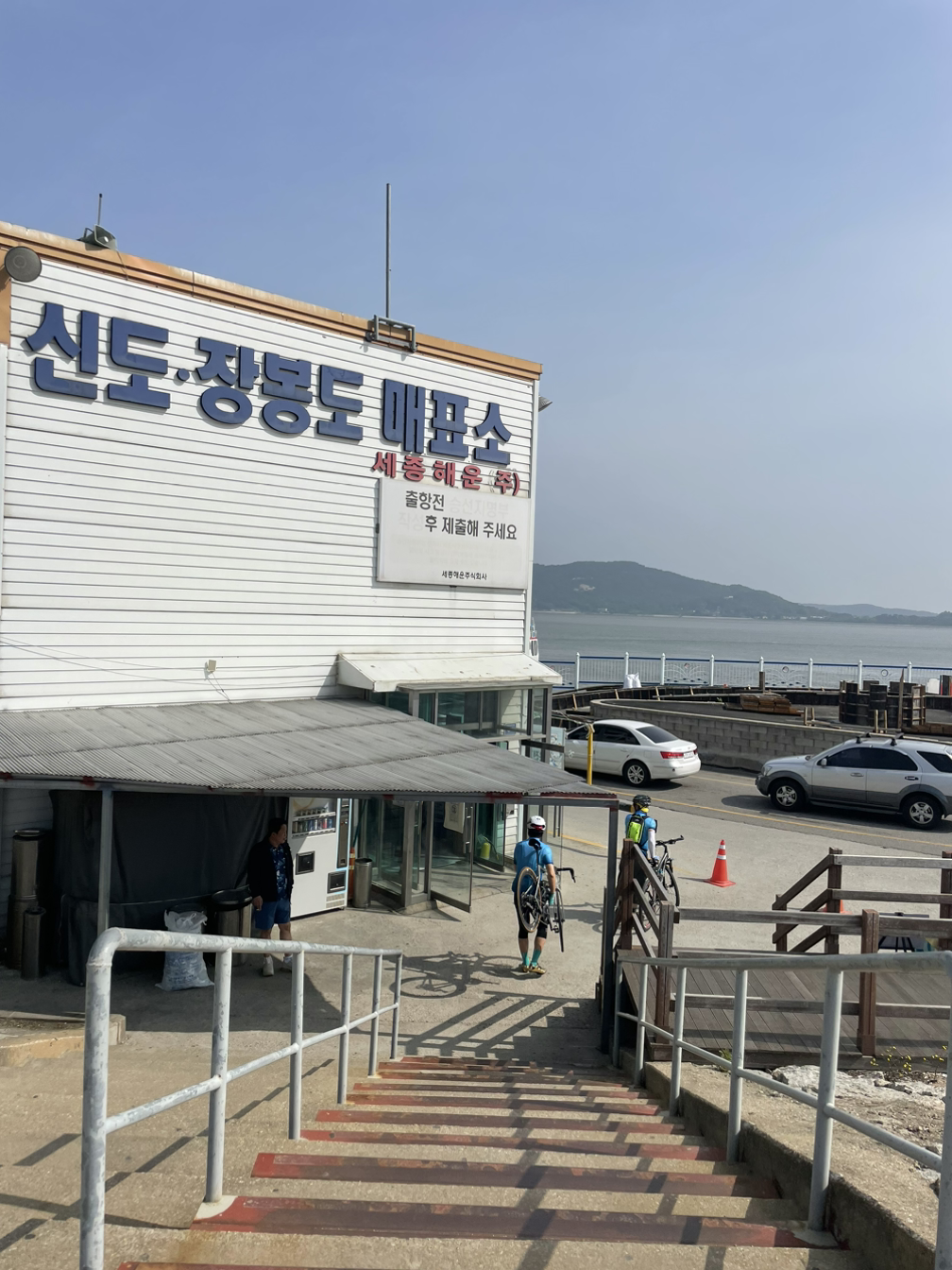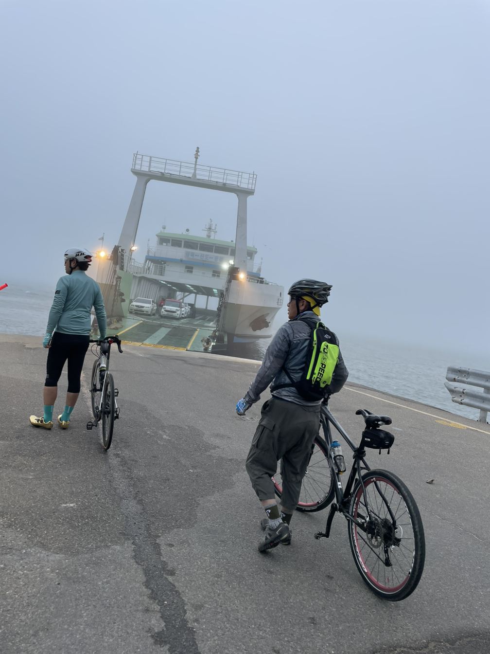 매 30분 간격으로 두 개의 선박회사가 운영하는 10분이 채 안 되는 배편이었지만 그 짧은 시간에도 우리의 캡틴은 지난번에 이어 둔근페달링에 대한 세세한 설명을 전한다. 신도항에 도착하자 둔근페달링에 적합한 클릭위치 및 안장위치를 조정하고 개별적으로 라이딩 자세를 코칭한다. 지난번 멤버들 모두 그 효과를 경험했던 터라 새로운 페달링에 맞춰 적극적으로 피팅을 하였다. 새로운 기술을 배웠으니 이제 써먹어 봐야지.