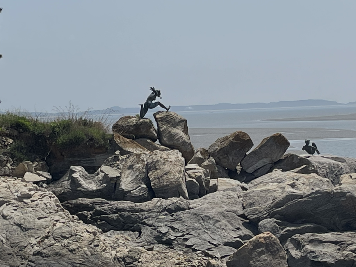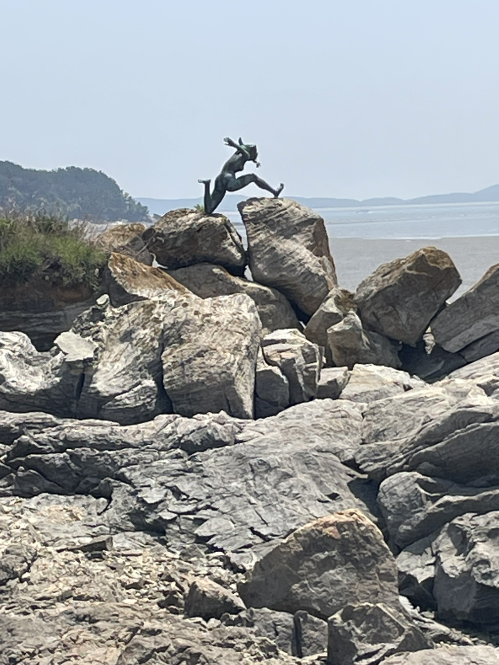 모도를 건너가는 다리옆 바위 위에 달리는 청춘남녀의 조각상, 의외성이 사람을 즐겁게 만든다.