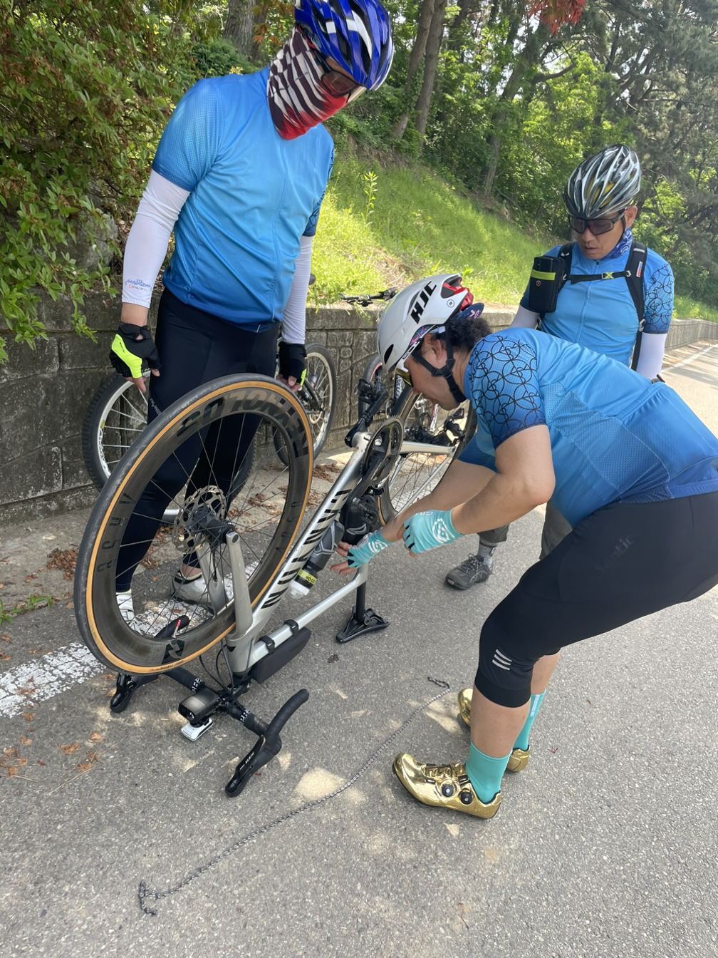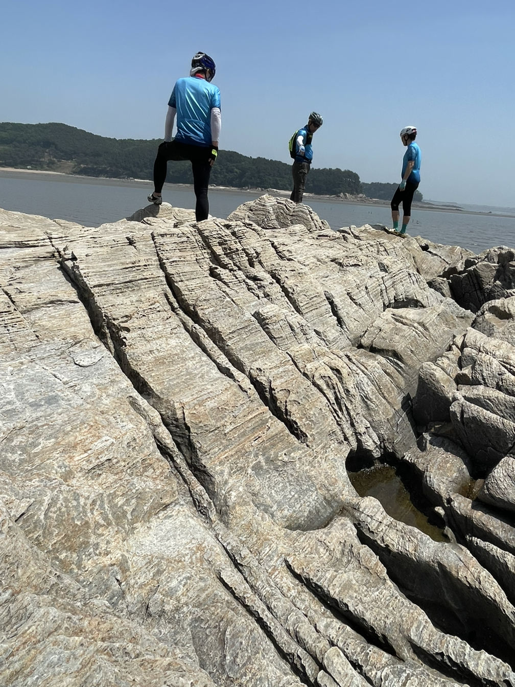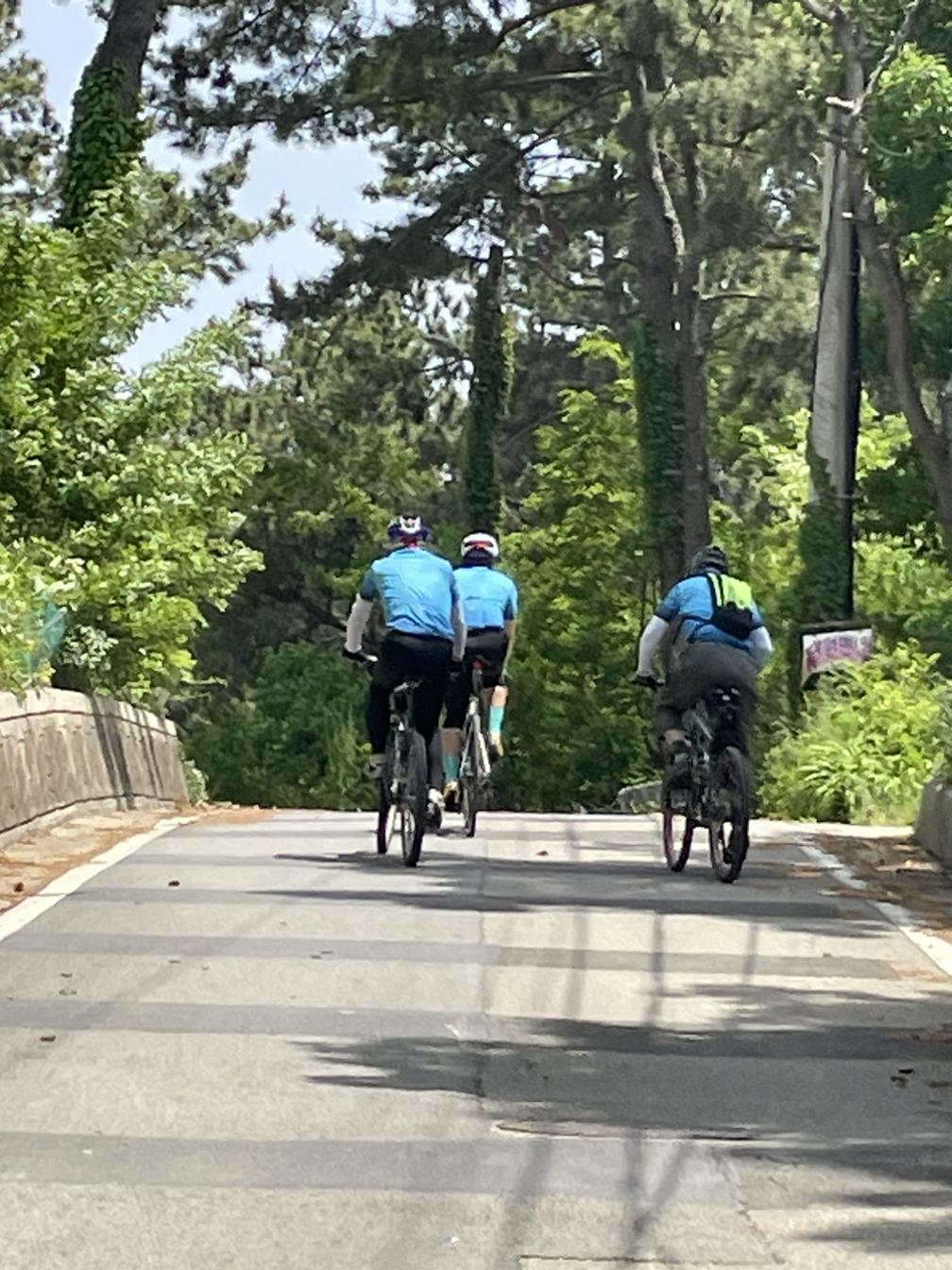 계절의 여왕이라는 수식어가 손색없는 5월의 맑고 푸른 하늘과 온몸을 감싸주는 선선한 바닷바람이 우리의 출발을 가볍게 응원해 준다. 작은 섬이라 섬을 관통하는 하나의 도로를 왕복하는 코스라는 게 다소 아쉽지만 도로를 전세 낸 듯 여유롭고 한적한 길은 최고의 선물이었다. 기쁨도 잠시 앞서 달리던 캡틴의 체인이 언덕길에서 끊어져 나갔다. 이럴 때가 제일 난감하다. 다행히 정비할 도구를 갖고 있어 함께 힘을 모아 끊어진 체인을 잘라버리고 새롭게 이어 붙이는 작업을 성공적으로 마칠 수 있었다. 이 순간 더욱 함께 함이 빛을 발한다. 즐거움을 함께하기도 하지만 위기의 상황에서 서로 함께해 준다는 것이 얼마나 큰 힘이 되는지 새삼 느끼게 된다.