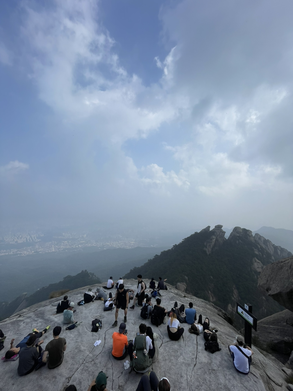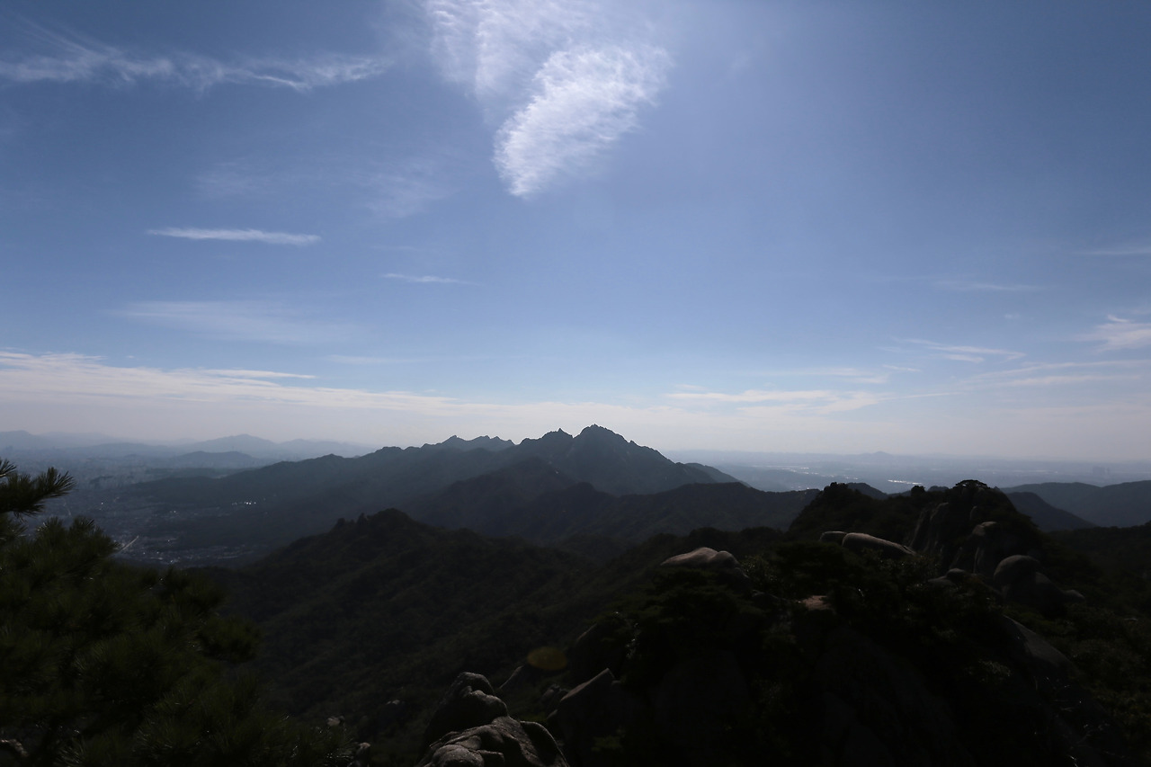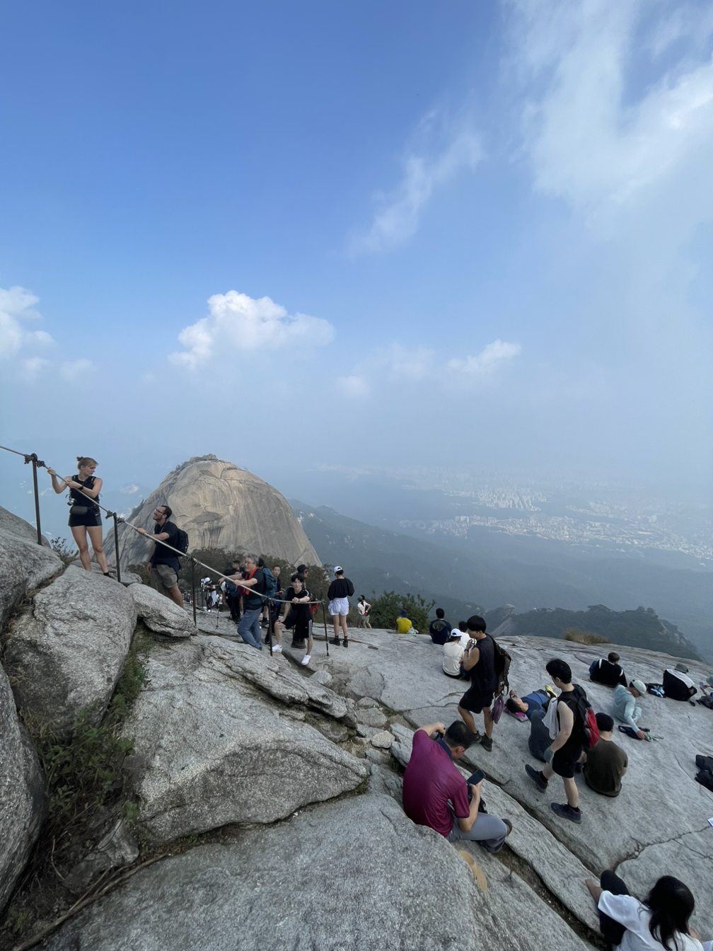 가파른 바위산길, 홀로 오르는 길이지만 맘은 편안하다. 힘들면 쉬고 걷는 속도도 그저 내 몸상태에 맞추면 된다. 한걸음 한걸음 체중을 엉덩이에서 허벅지, 종아리, 발끝까지 옮겨가며 리드미컬하게 오른다. 내딛는 걸음걸이에 멀리 떨어져 있는 가족들에 대한 그리운 마음 실어본다. 짬짬이 쉬면서 물을 마시고 가져온 사과조각으로 갈증을 풀어준다. 정말 꿀맛이다. 어느새 걷다 보니 정상에 가까웠다. 이곳은 이미 국제적인 명소가 되었다. 백운대 너른 바위 위에 다양한 국적의 많은 젊은이들이 활기찬 모습으로 가득하다. 곳곳에서 탄성이 울려 퍼진다.