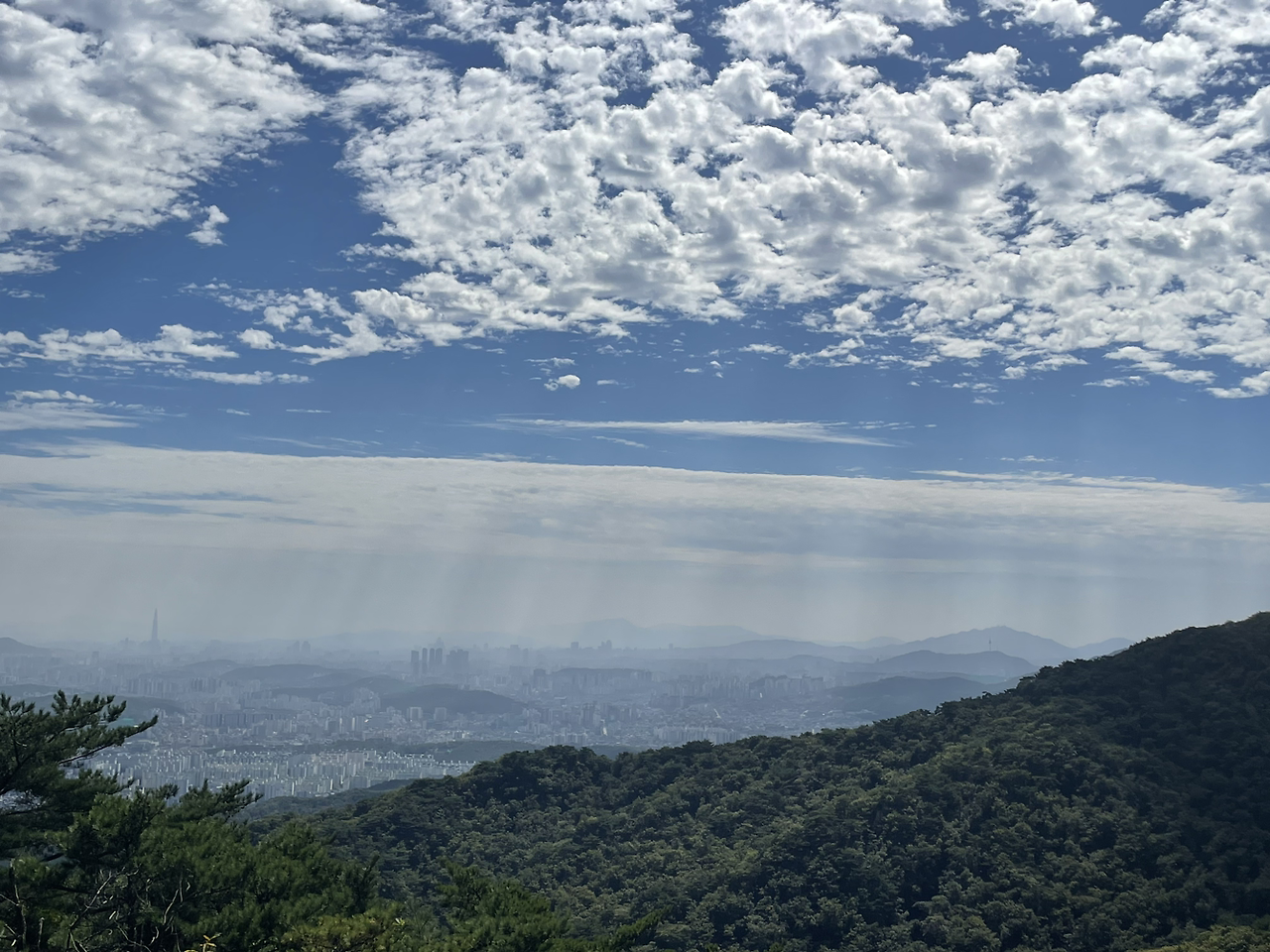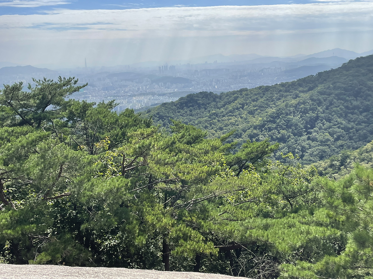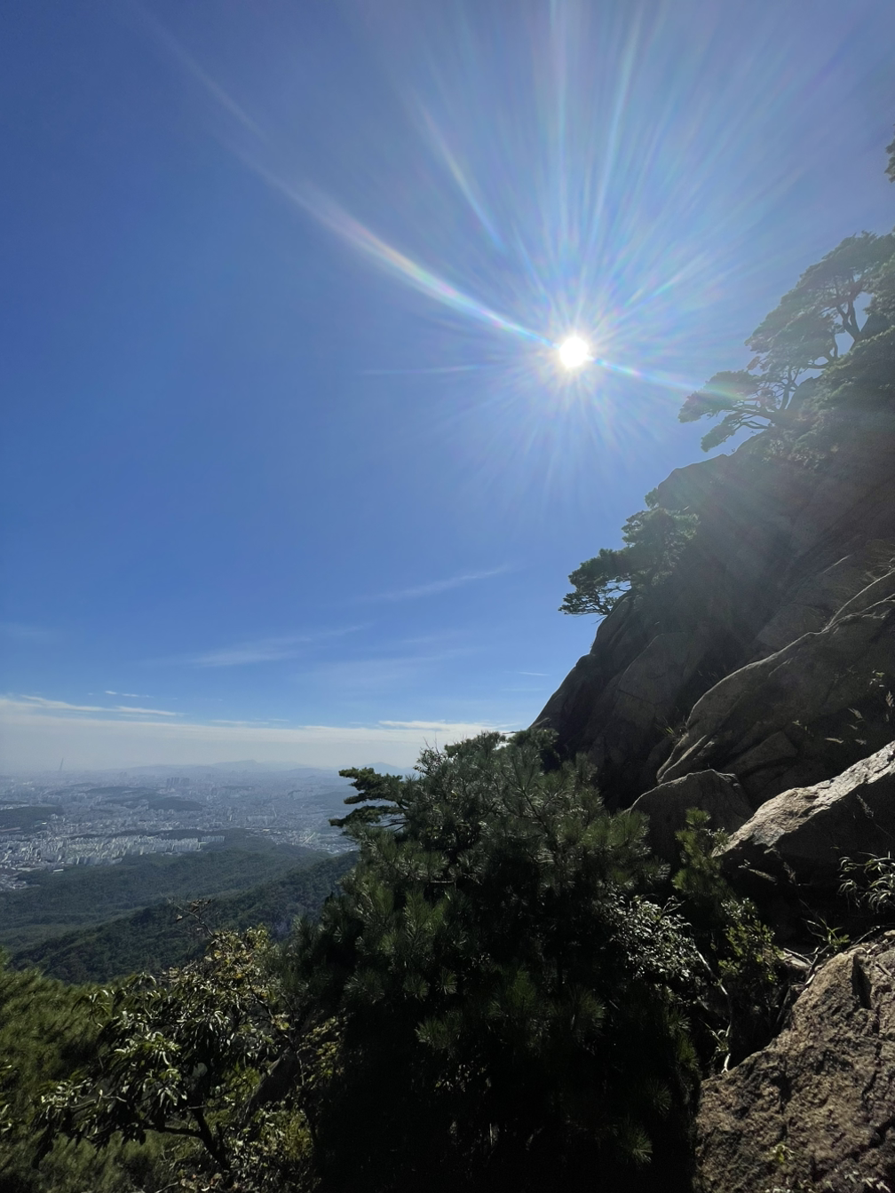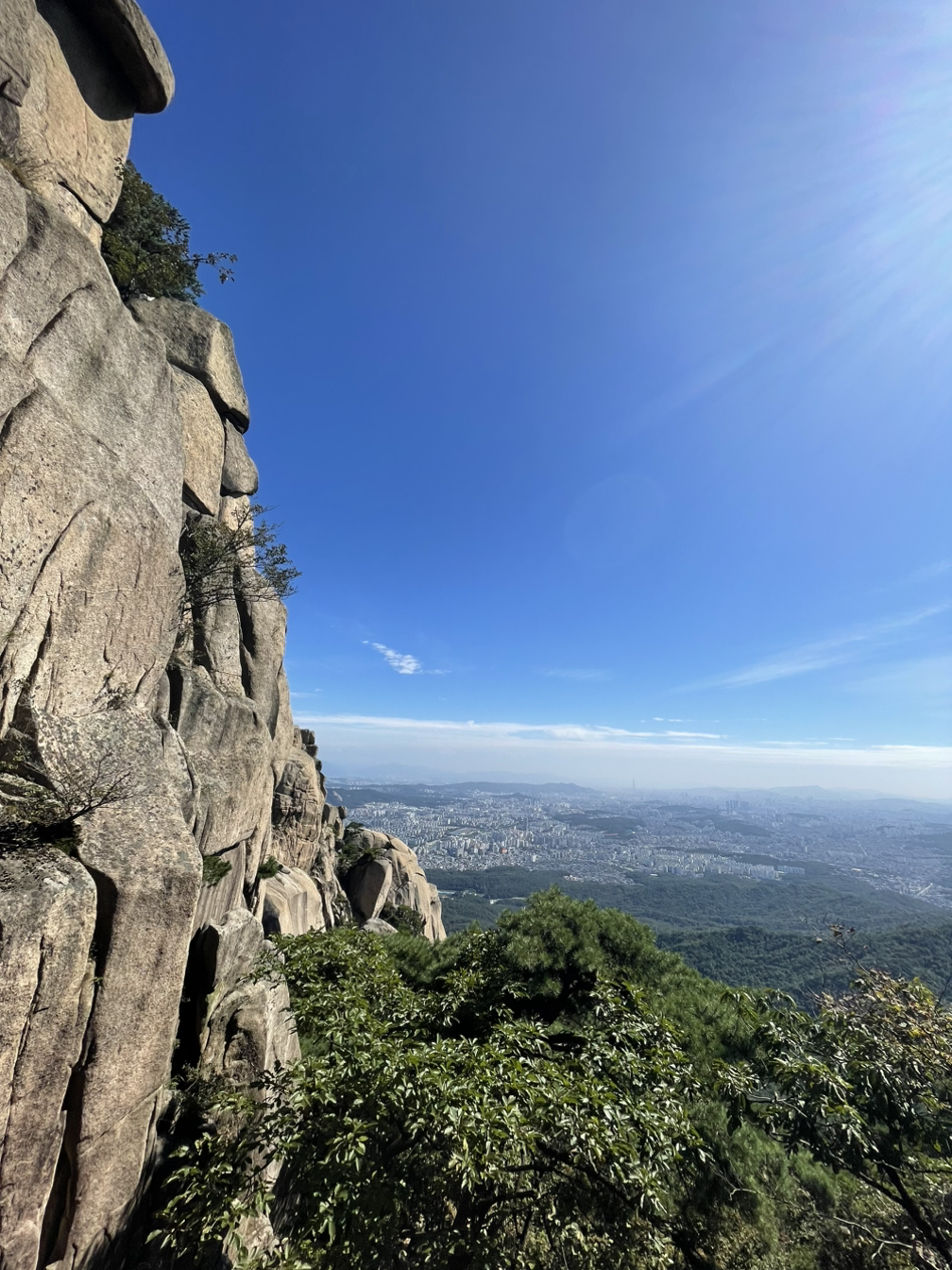 구슬땀을 쏟아내고 오른 마당바위에서 맞는 신선한 바람과 저 멀리 롯데타워, 남산타워까지 한눈에 펼쳐진 장관은 그간의 땀방울을 보상해 주고도 남았다.