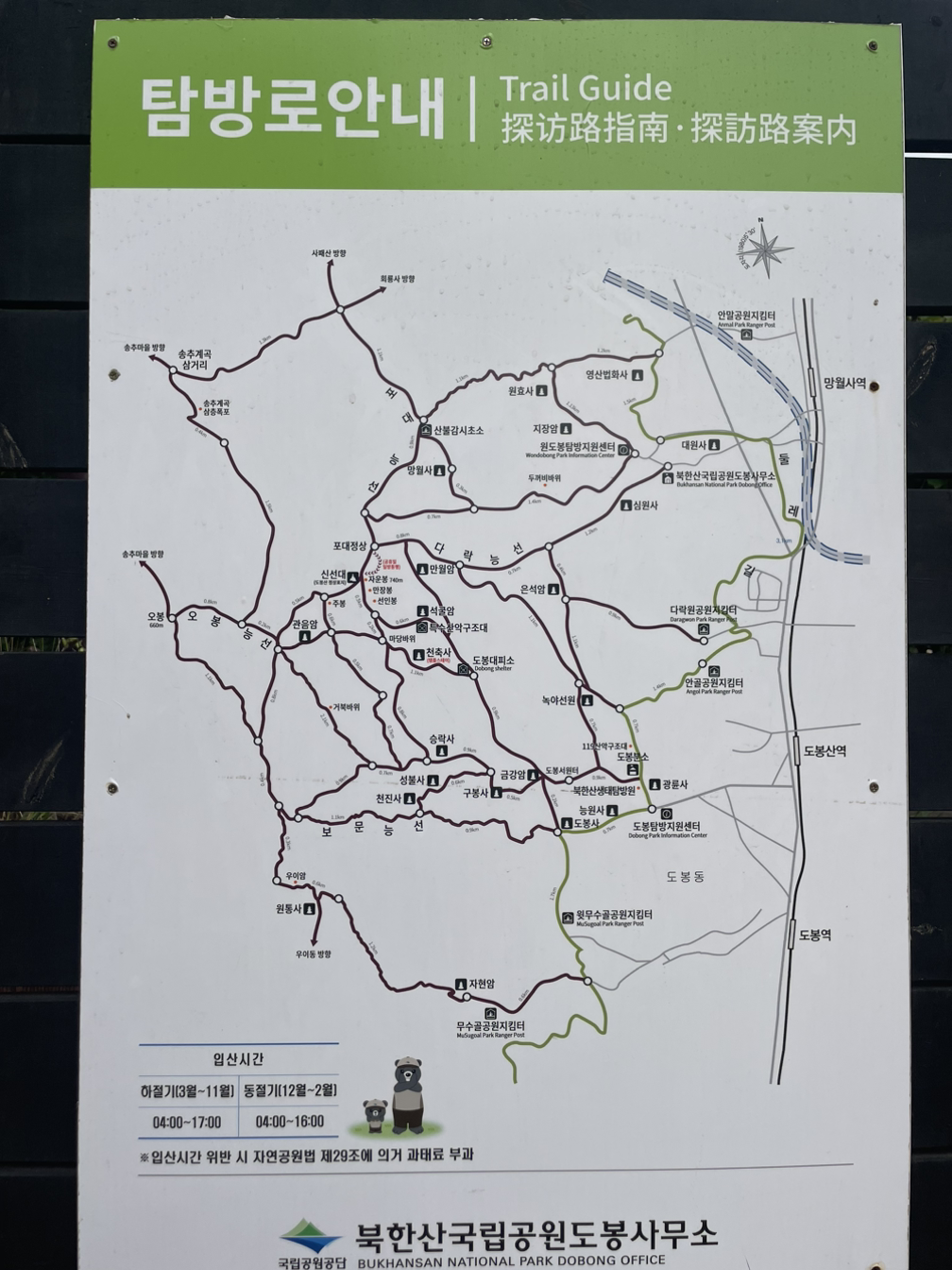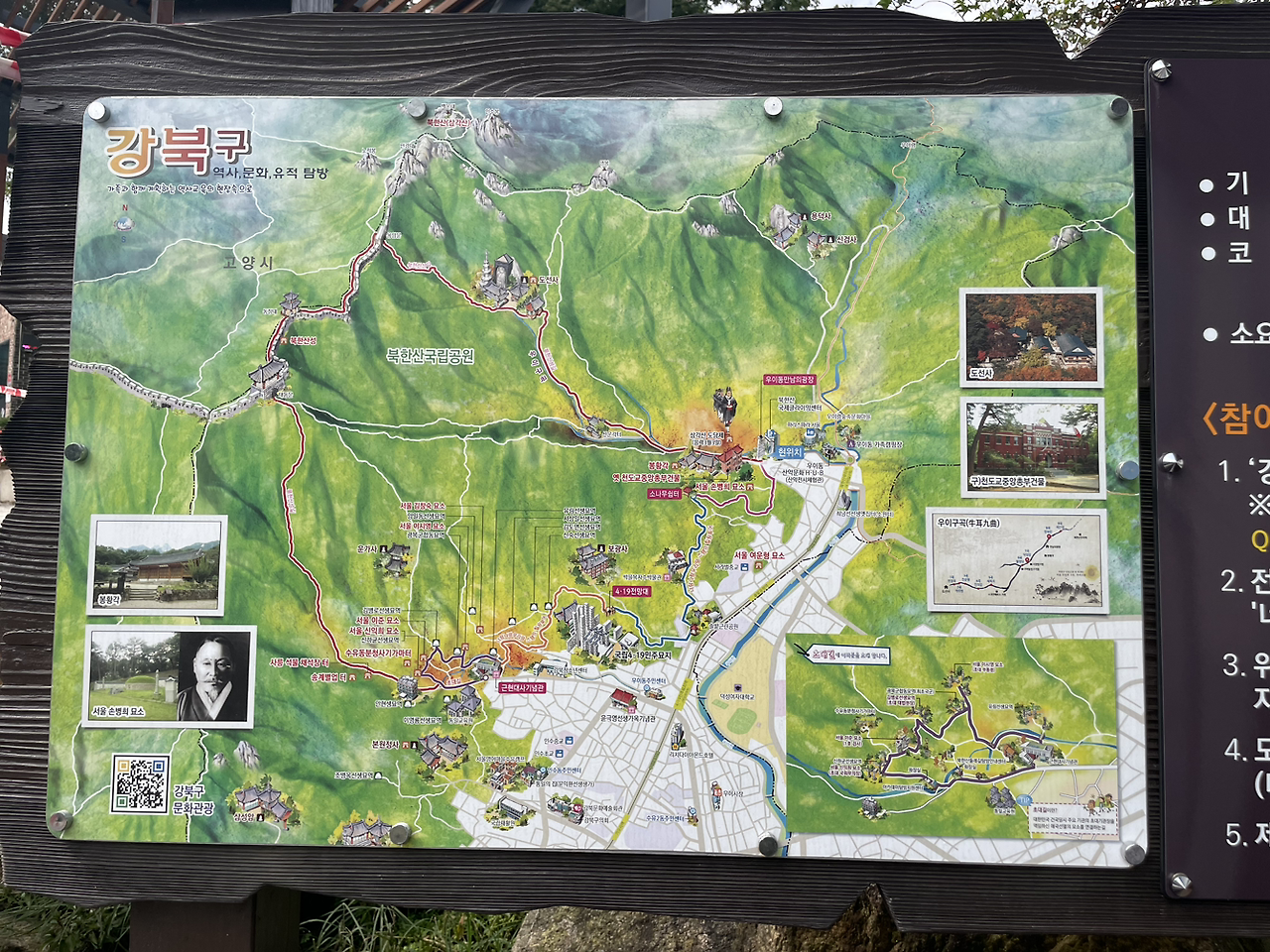 도봉산도 초행이라 안내표시판을 눈여겨 살펴둔다. 도봉산은 산전체가 하나의 화강암으로 이루어졌다니 놀랍다. 어제 보았던 북한산 바위의 감흥이 아직도 생생하다. 검버섯 가득한 바위에 새겨진 거친 주름은 세월의 깊이와 함께 장엄한 기상으로 가득했다.