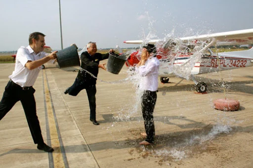 그 수많은 밤을 지새우며 꿈꾸었던 첫 솔로비행이 안전하게 끝이났다. 여기서 조종사들만의 전통이 하나가 남아있다. 윗 문단에 언급하였다시피 첫 솔로비행은 많은 사람들이 나와 그간의 노고를 축하하는 자리이다. 그렇다면 생일이나 다른 좋은 경사가 났을때처럼 단순히 케이크를 사서 초를 꼽고 축하할까? 그렇다면 조종사들이 전통이라고 부를 이유가 없다! 조종사들이 이니셜 솔로를 끝낸 동료를 축하하는 방식은 물을 뿌리는 것이다! 큰 양동이 및 수영장 근처 같은 곳에서 물을 가득 담아놓고 솔로비행을 하고 온 학생을 기다리고 있는다. 물론 착륙 직후에 시동을 끄면 다 같이 다가와서 박수도 치며 축하하고 사진도 찍고 하지만 하이라이트는 역시 물을 뿌리는 것이다!