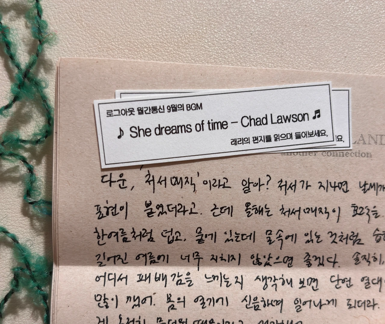 나는 그 힘이 손글씨에서 나온다고 느낀다. 필자의 손버릇이 담긴 글씨체는 마치 그 사람의 모습 같아서 사진을 보지 않아도 보이고 느껴진다. 어떨 땐 목소리도 들리는 듯하다. 그래서 로그아웃아일랜드를 통해 받는 편지는 이메일로 1초 만에 전송되는 텍스트에서는 절대 느낄 수 없는 사람 냄새가 난다. 나는 그게 너무 독특하고 아름다워서 첫 편지를 받았을 때 희한한 감동이 마음을 간지럽혔다.