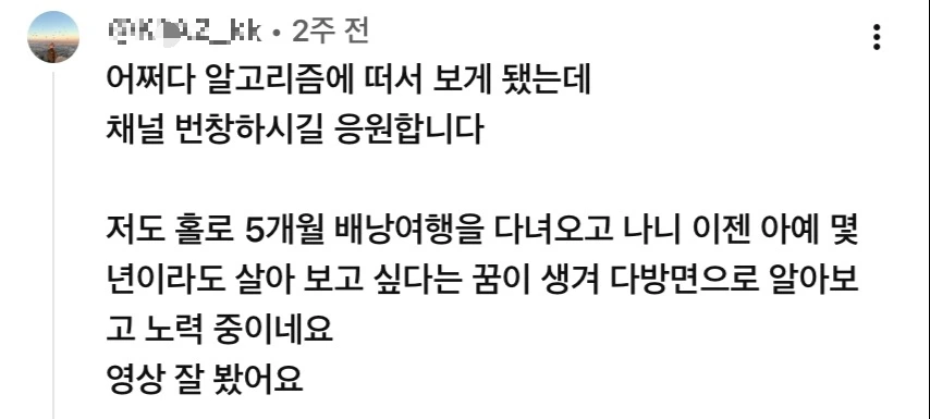 그런데 일주일즈음 지나자 유튜브에 처음으로 빨간 배지와 함께 알림이 떴다. 들어가 보니 갑자기 조회수가 1천을 넘었다. 아무것도 없어 휑하던 댓글창에 갑자기 사람들의 이런저런 감상평이 남겨져 있었다. “용기가 좋아요 힘내세요”같은 짤막한 응원부터, 어쩌다 알고리즘에 떠서 보게 됐는데 본인도 퇴사하고 배낭여행을 다녀왔다며 자기 이야기를 꺼내는 사람까지.