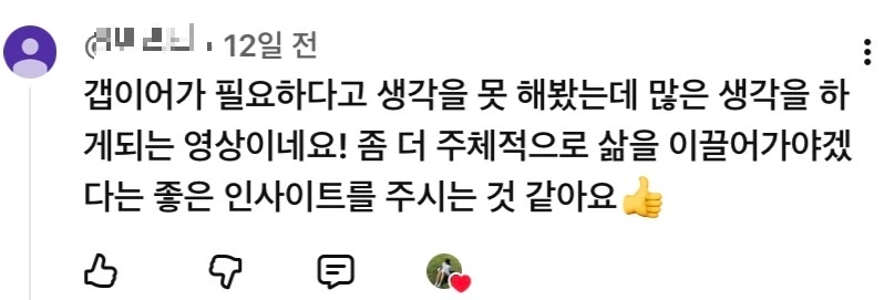 두 번째 영상이 올라갔다. 이번에는 퇴사하고 갭이어를 가지며 무얼 했는지, 어떤 깨달음을 얻었는지를 담은 콘텐츠였다. 역시나 초기에는 반응이 없었다. 그런데 3~4일 즈음 지났을 때 새로운 댓글이 달렸다. 갭이어가 필요하다고 생각해 본 적 없는데 덕분에 다시 생각하게 됐다는 긴 댓글이었다. 또 첫 영상 악플에 내 편을 들어주는 대댓글도 달렸다. “본인의 인생은 본인이 책임지는 거죠. 타인의 인생을 쉽게 말하지 맙시다.”