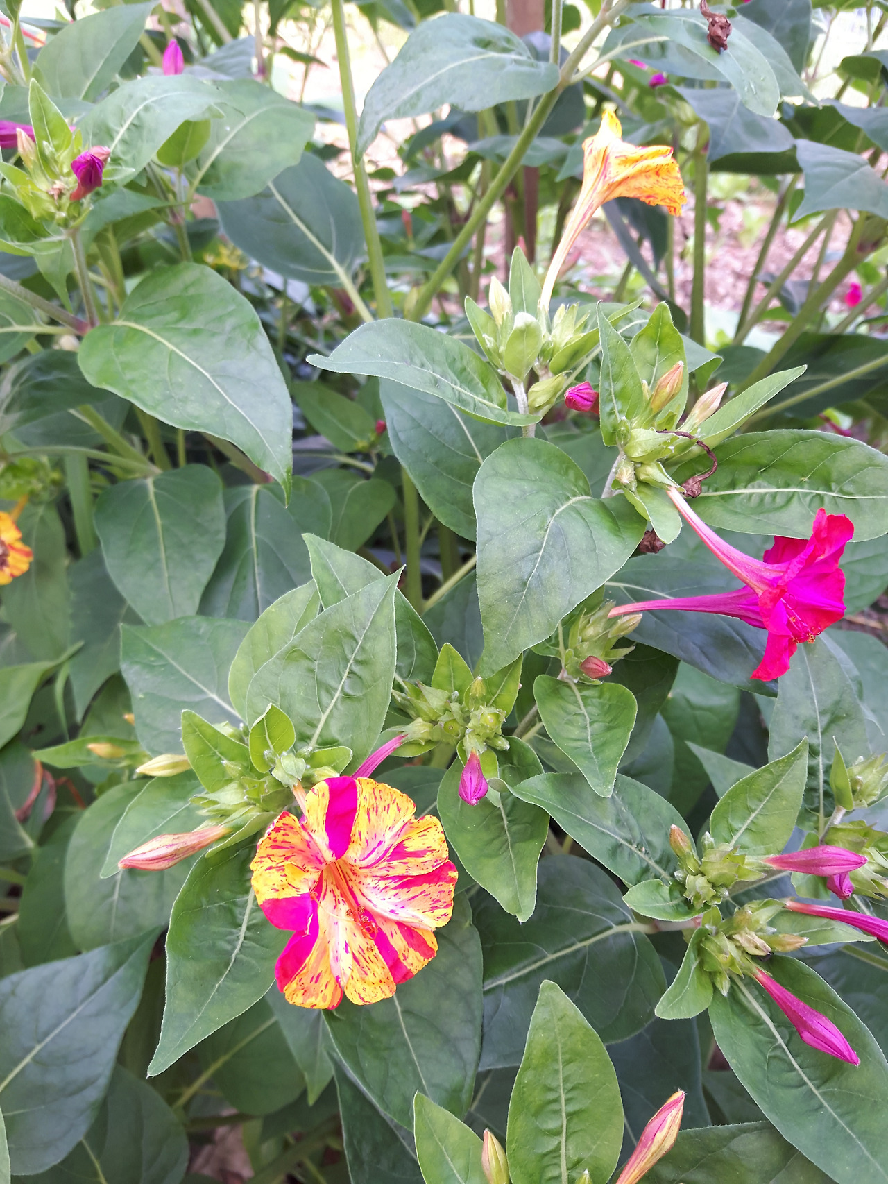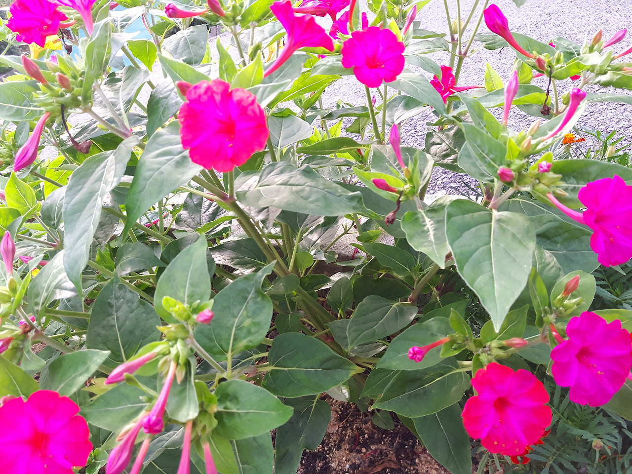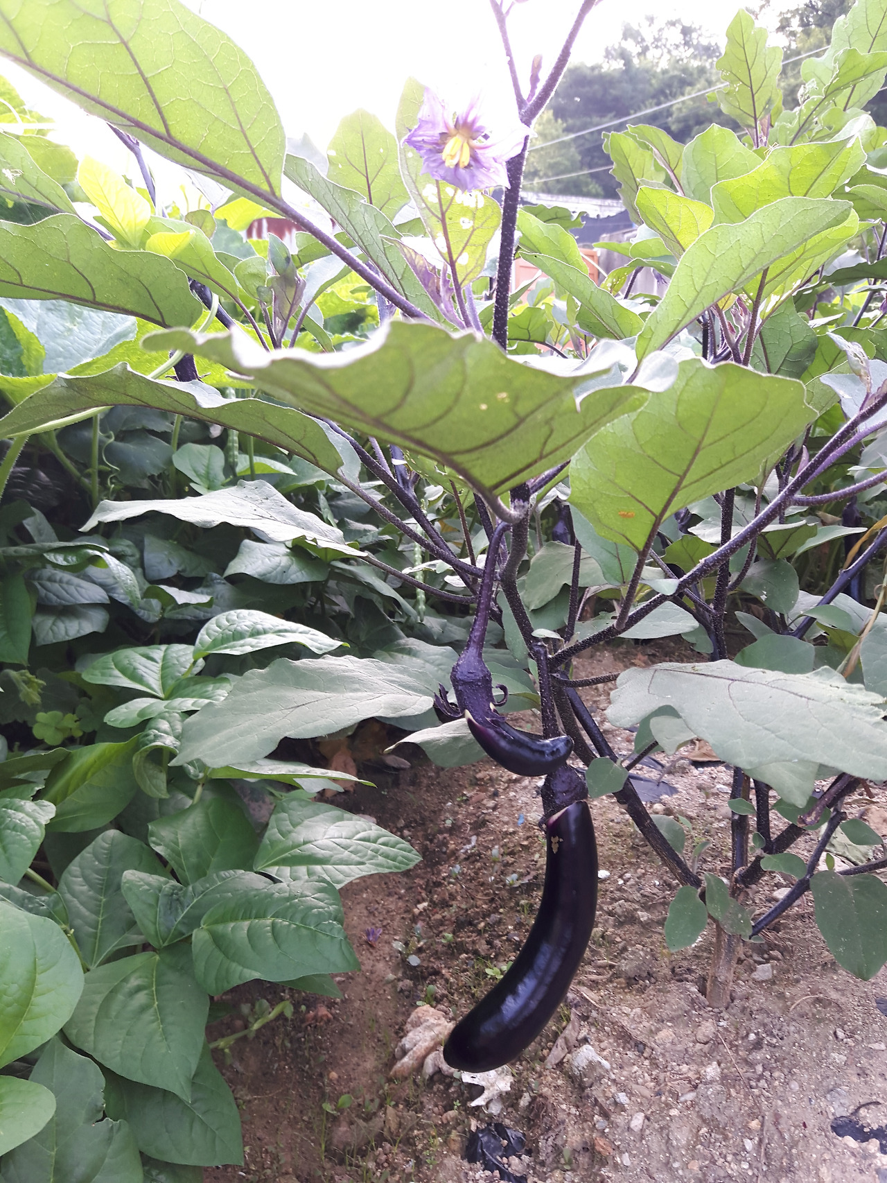 그 옆에는 아직 아침이라 활짝 피어난 분꽃이 후북하다. 마치 유년의 텃밭에 온듯하다. 분꽃도 가지도 죄다 눈에 익은 채소들이라 반갑다.
