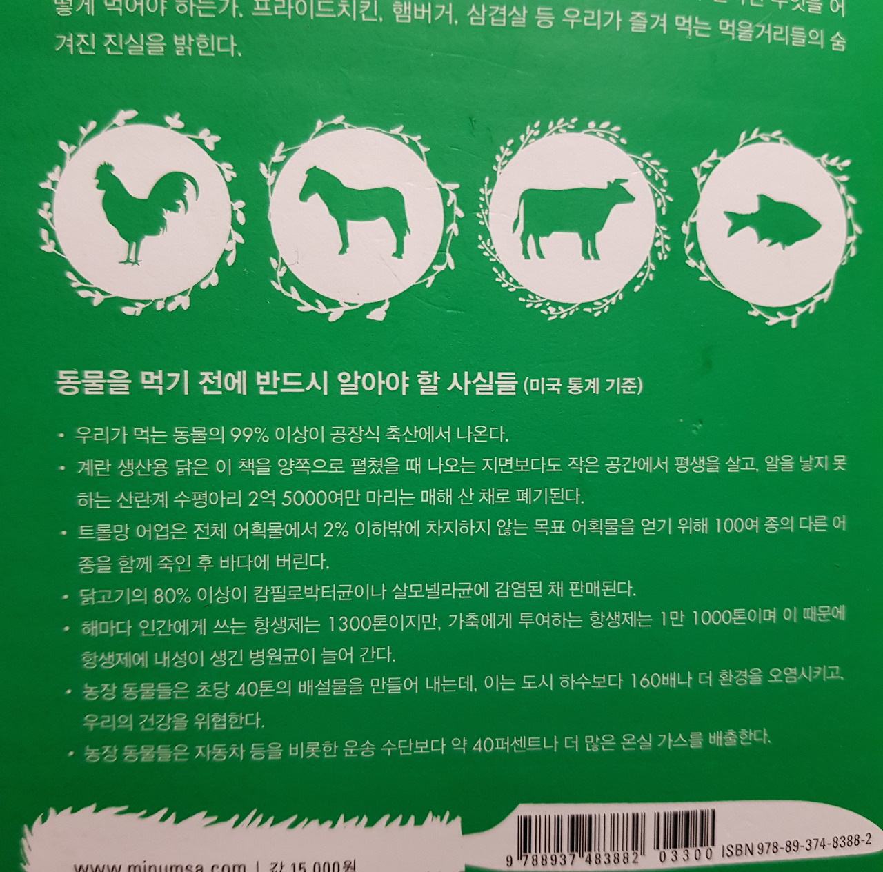 (닭의) 피부에 깃털에 묻은 배설물이 탱크 속에 남기 때문에 새들은 피부에 병원균이 스미거나 흡수되어 균을 가득 품게 된다……누런 고름을 질질 흘리며 초록색 배설물로 더럽혀지고 해로운 박테리아에 오염되었거나 폐와 심장이 감염되었거나 종양이 있거나 피부 상태가 나쁜 새들 수백만 마리가 소비자들에게 팔리기 위해 매주 배송된다. (pp. 176~177)