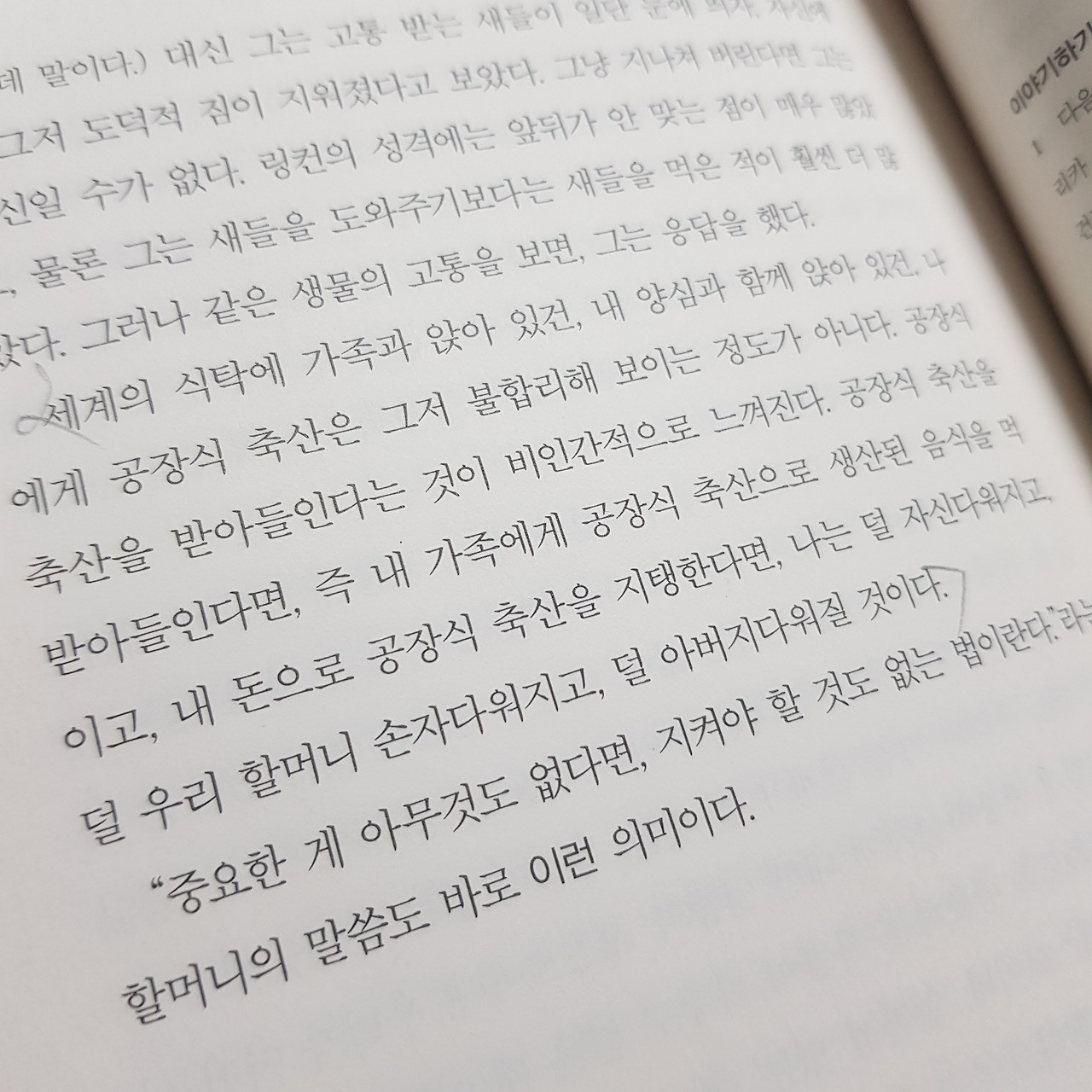 목장주도 채식주의자가 될 수 있고, 채식주의자가 도축장을 지을 수도 있고, 나는 최상의 축산업을 지지하는 채식주의자가 될 수 있다. (p. 336)
