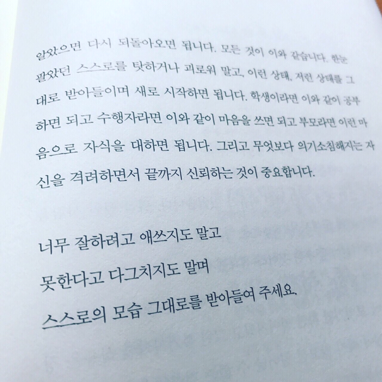 이런 상태, 저런 상태를 그대로 받아들이며 새로 시작하면 됩니다. 의기소침해지는 자신을 격려하면서 끝까지 신뢰하는 것이 중요합니다. 너무 잘하려고 애쓰지도 말고못한다고 다그치지도 말며스스로의 모습 그대로를 받아들여 주세요. #정목스님 #꽃도꽃피우기위해애를쓴다 #치유에세이 #좋은글 #받아들임 #격려 #신뢰