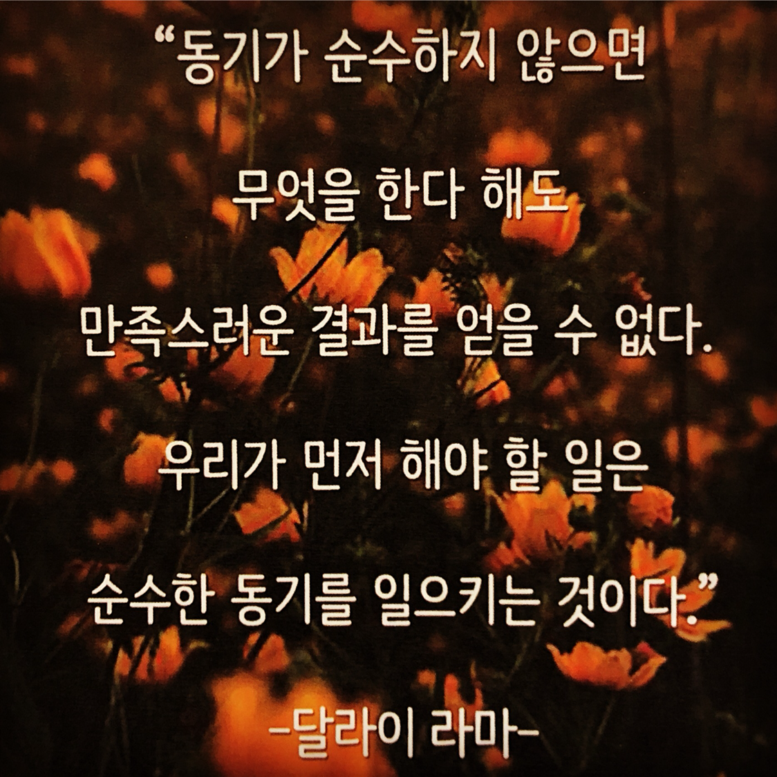 동기가 순수하지 않으면 무엇을 한다 해도만족스러운 결과를 얻을 수 없다.우리가 먼저 해야 할 일은 순수한 동기를 일으키는 것이다. -달라이 라마-
