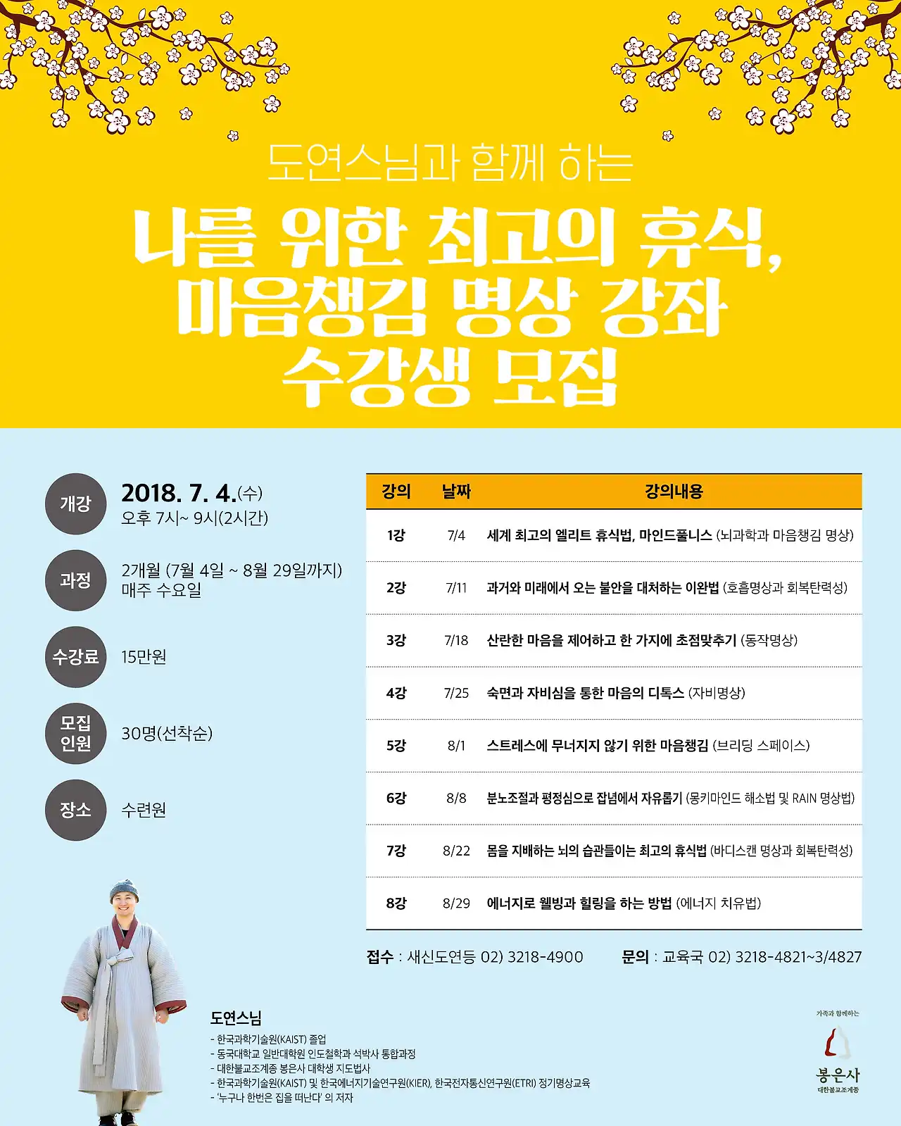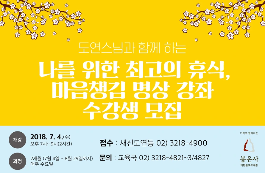 7월부터 봉은사에서 명상프로그램을 시작합니다. (8주과정)"나를 위한 최고의 휴식, 마음챙김 명상 (입문반)"불교와 뇌과학에 근거한 마음챙김(Mindful)을 바탕으로,1)명상에 기본개념과 효과에 대해 이해한다. 2)마음챙김에 기반한 다양한 명상법을 실습해본다.3)명상을 통한 건강회복, 스트레스 감소, 삶의 질 향상의 효과를 기대한다. #봉은사 #도연스님 #명상 #치유 #힐링 #마음챙김