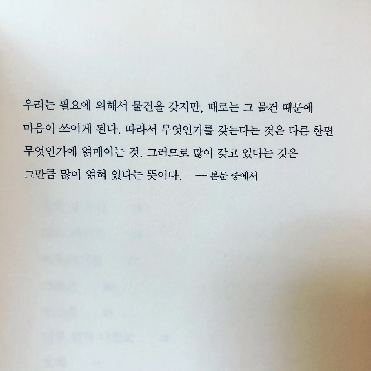 우리는 필요에 의해서 물건을 갖지만, 때로는 그 물건 때문에 마음이 쓰이게 된다. 따라서 무엇인가를 갖는다는 것은 다른 한편 무엇인가에 얽매이는 것.그러므로 많이 갖고 있다는 것은 그만큼 많이 얽혀 있다는 뜻이다.