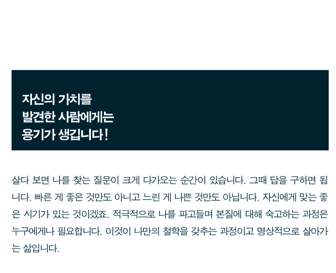 살다 보면 나를 찾는 질문이 크게 다가오는 순간이 있습니다. 그때 답을 구하면 됩 니다. 빠른 게 좋은것 만도 아니고 느린게 나쁜 것만도 아닙니다. 자신에게 맞는 좋은 시기가 있는 것이겠죠.