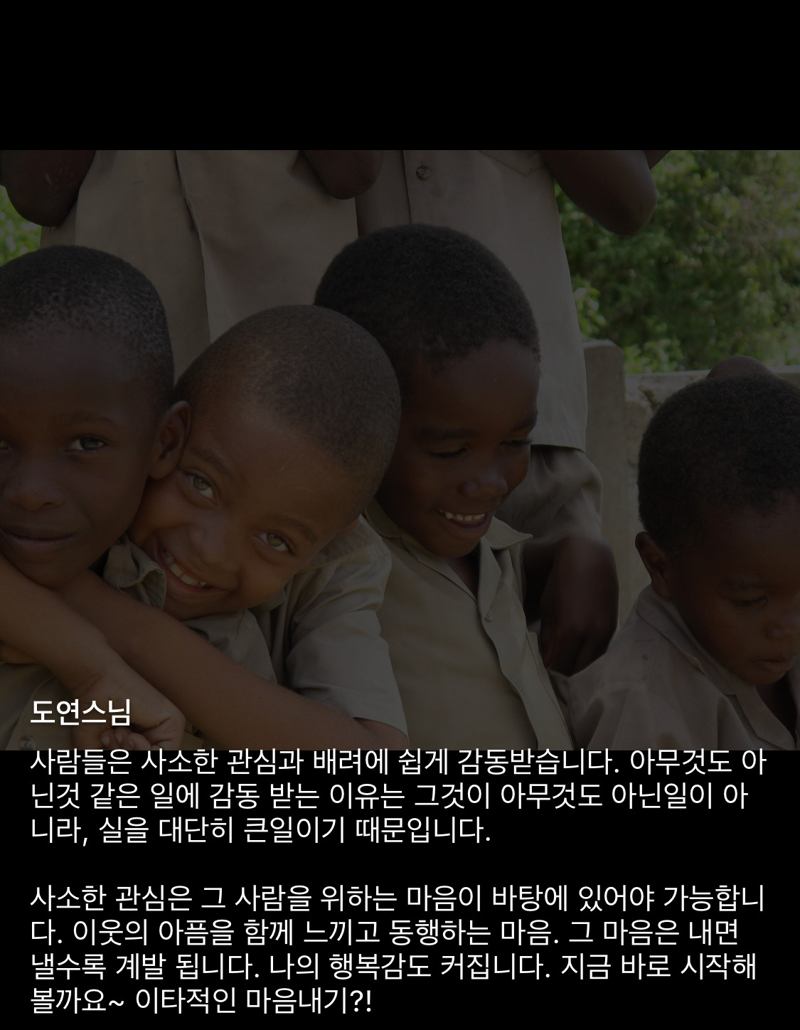 사소한 관심은 그 사람을 위하는 마음이 바탕에 있어야 가능합니다. 이웃의 아픔을 함께 느끼고 동행하는 마음. 그 마음은 내면 낼수록 계발 됩니다. 나의 행복감도 커집니다. 지금 바로 시작해 볼까요~ 이타적인 마음내기?!