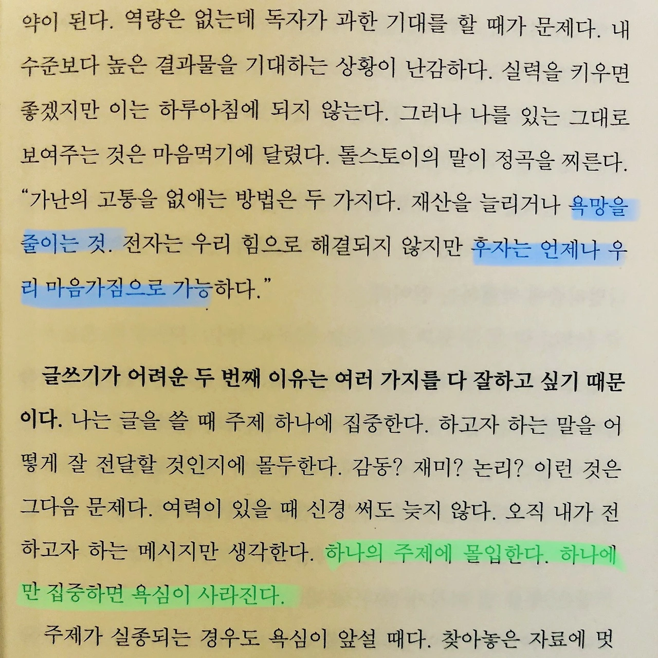 욕망을 줄이는 것은 우리 마음가짐으로 가능하다.하나의 주제에 집중하고 몰입하면 욕심이 사라진다.#강원국의글쓰기 #문제는욕심이다