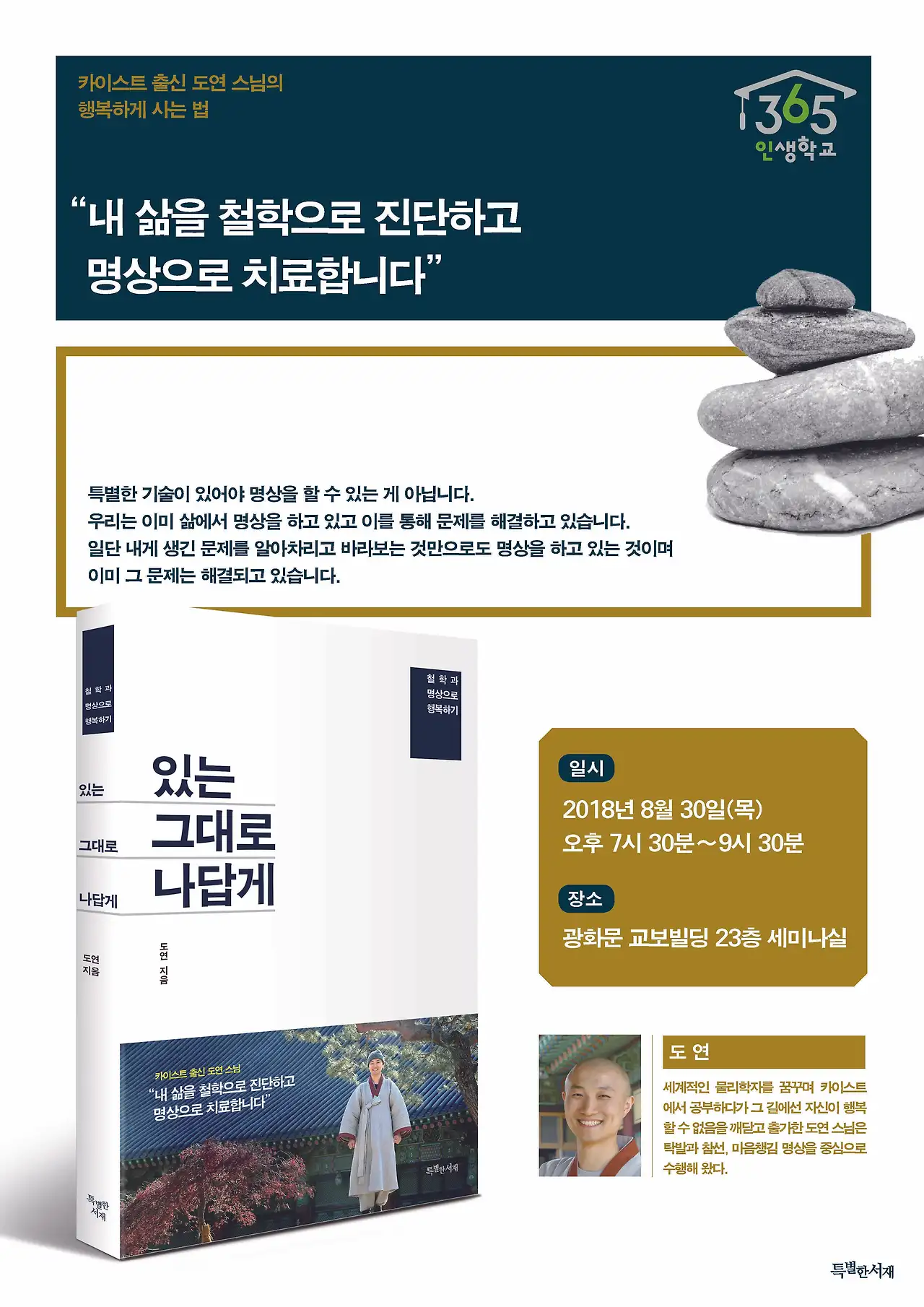 이번주 목요일 저녁에 교보문고 광화문점에서 <있는 그대로 나답게> 출간기념 첫 북토크를 합니다.운명의 주인공으로 사는 법지금 바로 숨을 통해 쉬는 법명상과 철학으로 행복하게 사는 법저자 사인하는 시간을 갖습니다.반갑게 만나요~^^#있는그대로나답게 #도연스님 #특별한서재 #교보문고