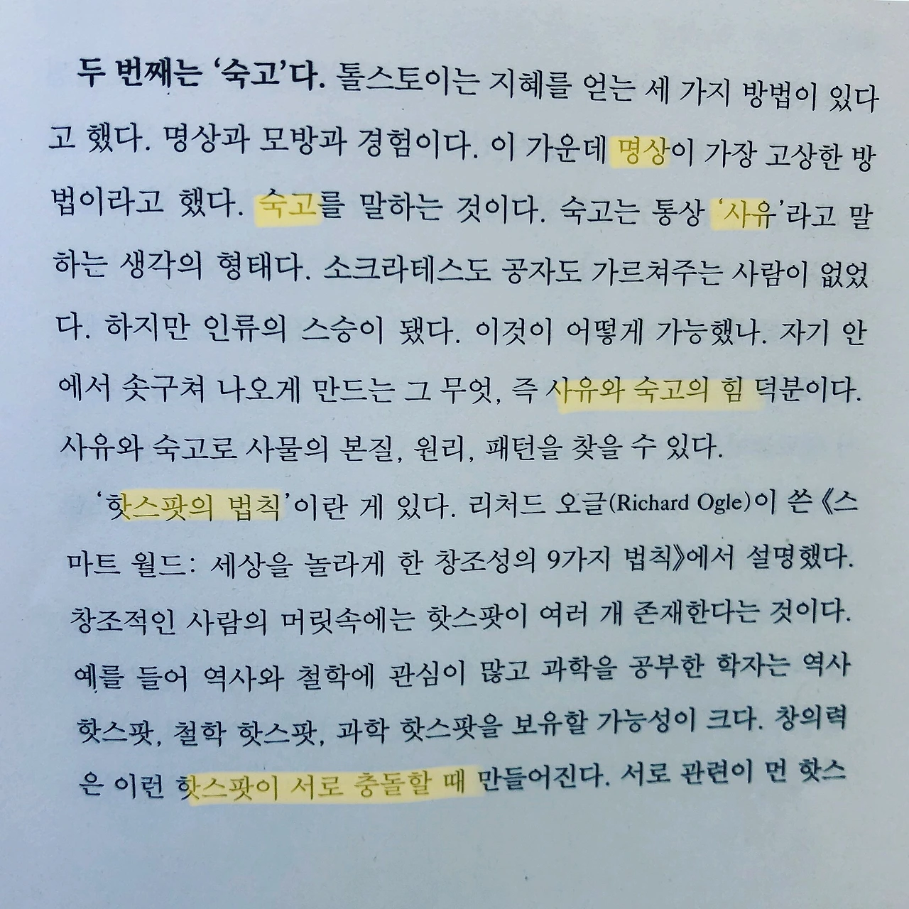 두 번째는 ‘숙고'다. 톨스토이는 지혜를 얻는 세 가지 방법이 있다고 했다. 명상과 모방과 경험이다. 이 가운데 명상이 가장 고상한 방법이라고 했다. 숙고를 말하는 것이다.