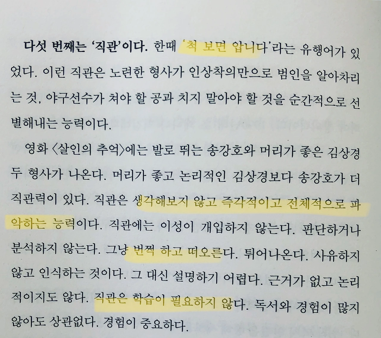 다섯 번째는 '직관이다. 한때 '척 보면 압니다’라는 유행어가 있었다. 이런 직관은 노련한 형사가 인상착의만으로 범인을 알아차리는 것, 야구선수가 쳐야 할 공과 치지 말아야 할 것을 순간적으로 선별해내는 능력이다. 영화 〈살인의 추억>에는 발로 뛰는 송강호와 머리가 좋은 김상경 두 형사가 나온다. 머리가 좋고 논리적인 김상경보다 송강호가 더 직관력이 있다.