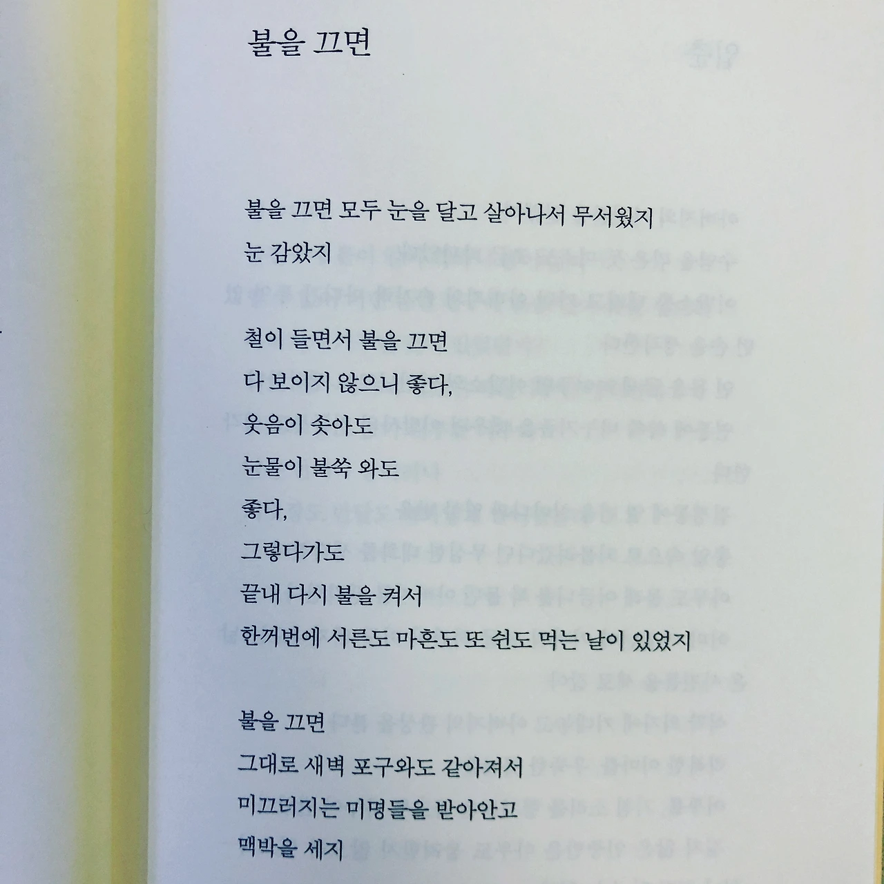 #불을끄면철이 들면서 불을 끄면다 보이지 않으니 좋다불을 끄면그대로 새벽 포구와도 같아져서미끄러지는 미명들을 받아안고맥박을 세지#장석남 #뺨에서쪽을빛내다
