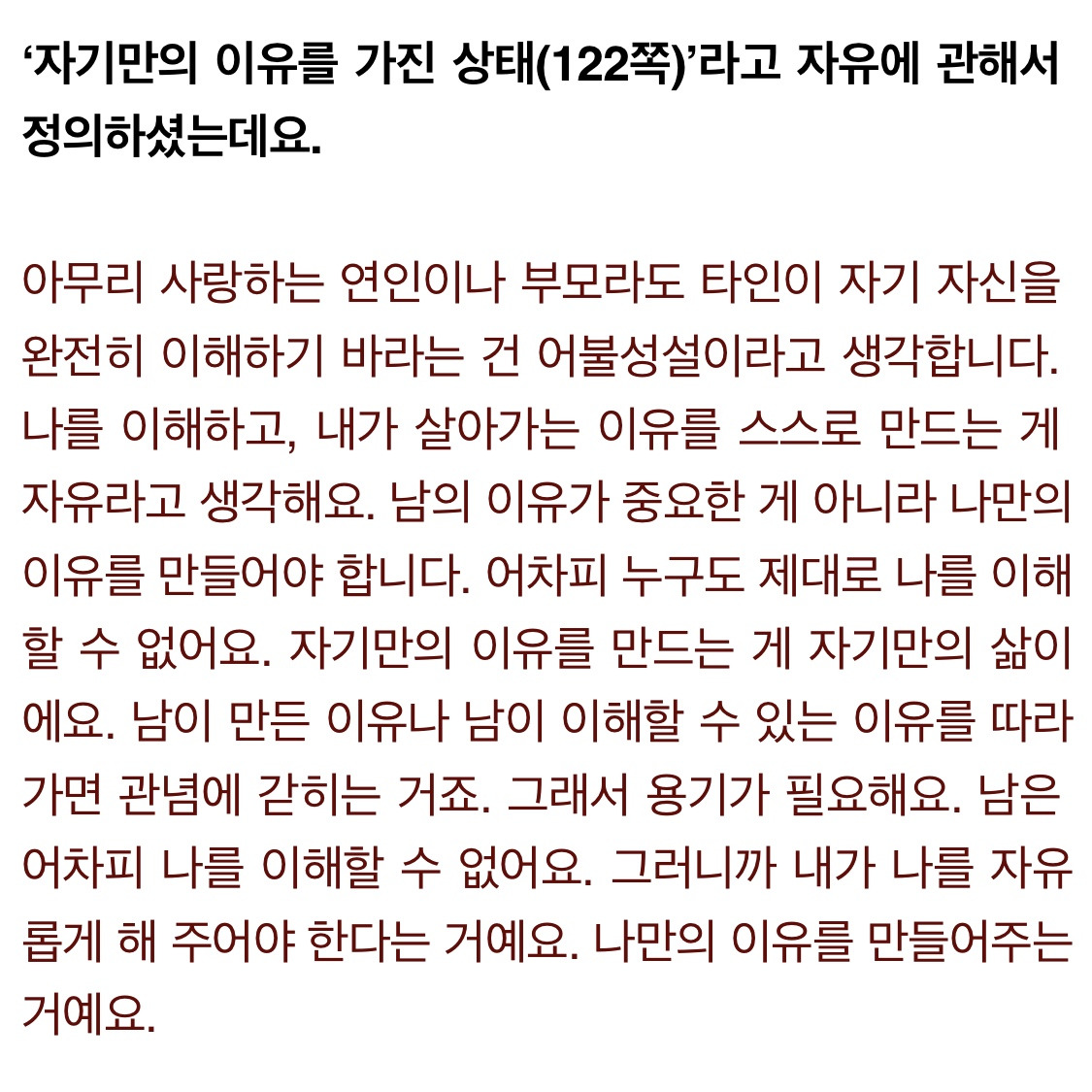 A)아무리 사랑하는 연인이나 부모라도 타인이 자기 자신을 완전히 이해하기 바라는 건 어불성설이라고 생각합니다. 나를 이해하고, 내가 살아가는 이유를 스스로 만드는 게 자유라고 생각해요. 남의 이유가 중요한 게 아니라 나만의 이유를 만들어야 합니다. 어차피 누구도 제대로 나를 이해할 수 없어요. 자기만의 이유를 만드는 게 자기만의 삶이에요. 남이 만든 이유나 남이 이해할 수 있는 이유를 따라가면 관념에 갇히는 거죠. 그래서 용기가 필요해요. 남은 어차피 나를 이해할 수 없어요. 그러니까 내가 나를 자유롭게 해 주어야 한다는 거예요. 나만의 이유를 만들어주는 거예요.