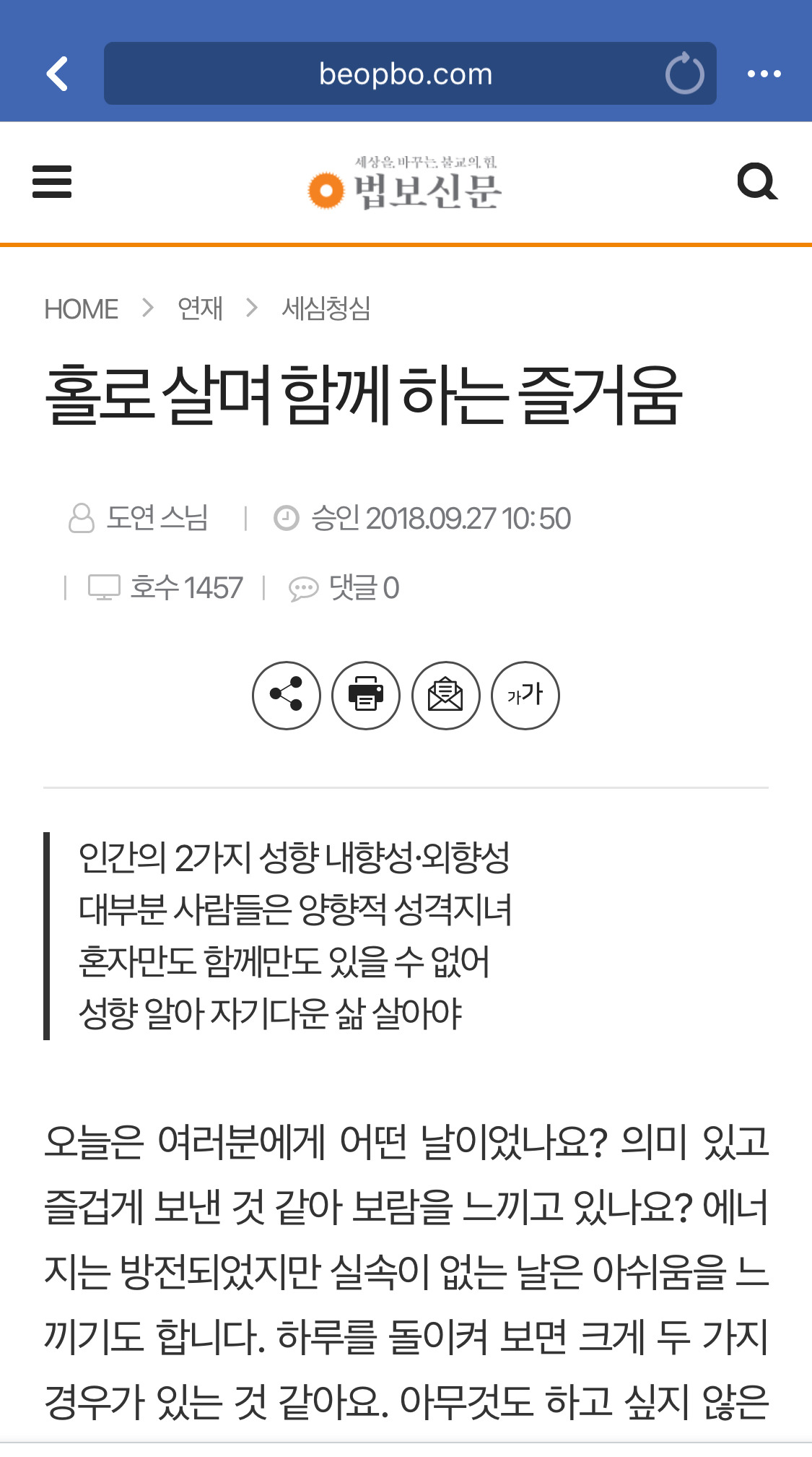 <홀로 살며 함께 하는 즐거움>법보신문 세심청심 코너에 연재 시작했습니다. 한 달에 한 번 찾아 뵈려고 해요.혼자이지만 함께인 나와 우리.자기 성향 알아 나다운 삶 살 수 있길 발원합니다.원문 보기: http://www.beopbo.com/news/articleView.html?idxno=201930