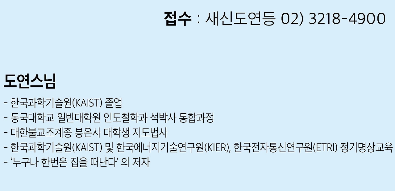 최고의 휴식 #마음챙김 #명상이번 주에 금요반, 다음 주에 수요반 개강합니다.입문반과 심화반 레벨차는 거의 없습니다.참여하기 용이한 시간에 오시면 됩니다^^금요반은 2.15 오후 7시부터수요반은 2.20 오후 7시부터 입니다.새해를 명상으로 열어보세요^^봉은사 명상 프로그램02-3218-4900 (접수처)02-3218-4821 (담당부서)#봉은사 #도연스님 #호흡법