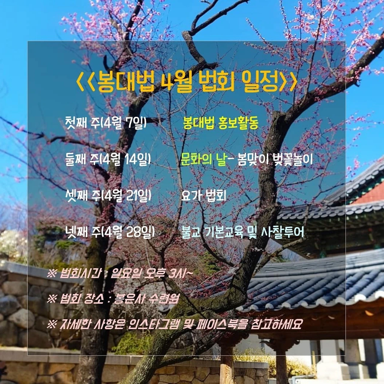 둘째 주(4월 14일)는 오랜만의 야외법회입니다. 벚꽃놀이 같이 하면서 힐링해봐요