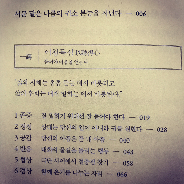 이청득심以聽得心들어야 마음을 얻는다."삶의 지혜는 종종 듣는 데서 비롯되고 삶의 후회는 대개 말하는 데서 비롯된다."#말의품격 #이기주작가