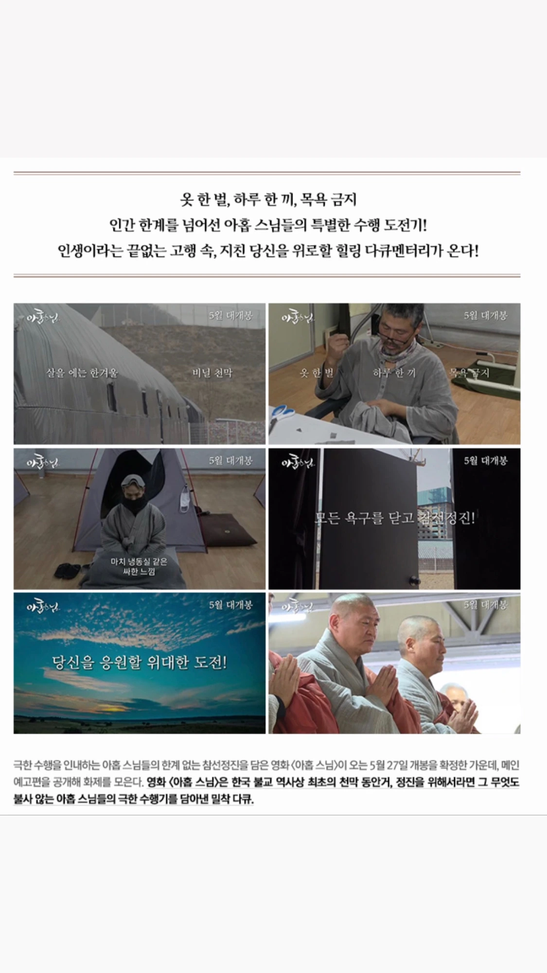 아홉 스님의 수행기 ‘아홉 스님’은 5월27일 전국 롯데시네마 상영관에서 만날 수 있습니다. (러닝타임 72분)