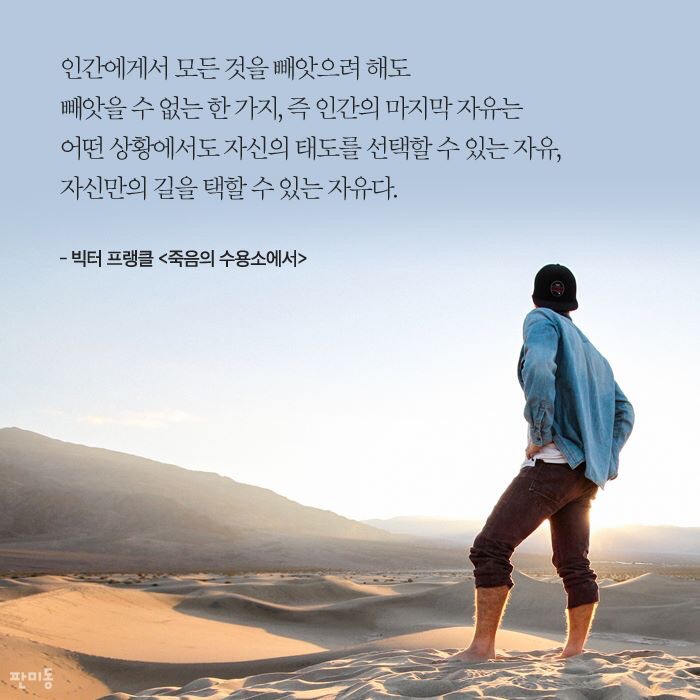 인간에게서 모든 것을 빼앗으려 해도빼앗을 수 없는 한 가지, 즉 인간의 마지막 자유는어떤 상황에서도 자신의 태도를 선택할 수 있는 자유,자신만의 길을 택할 수 있는 자유다.-빅터 프랭클 <죽음의 수용소에서>