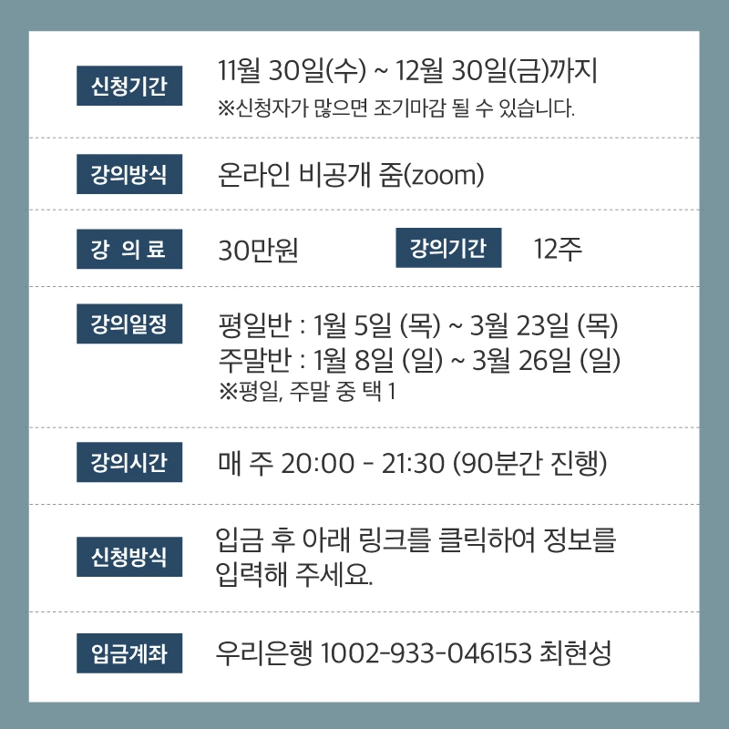 2)주말반 : 1월 8일 (일요일) ~ 3월 26일 (일요일)