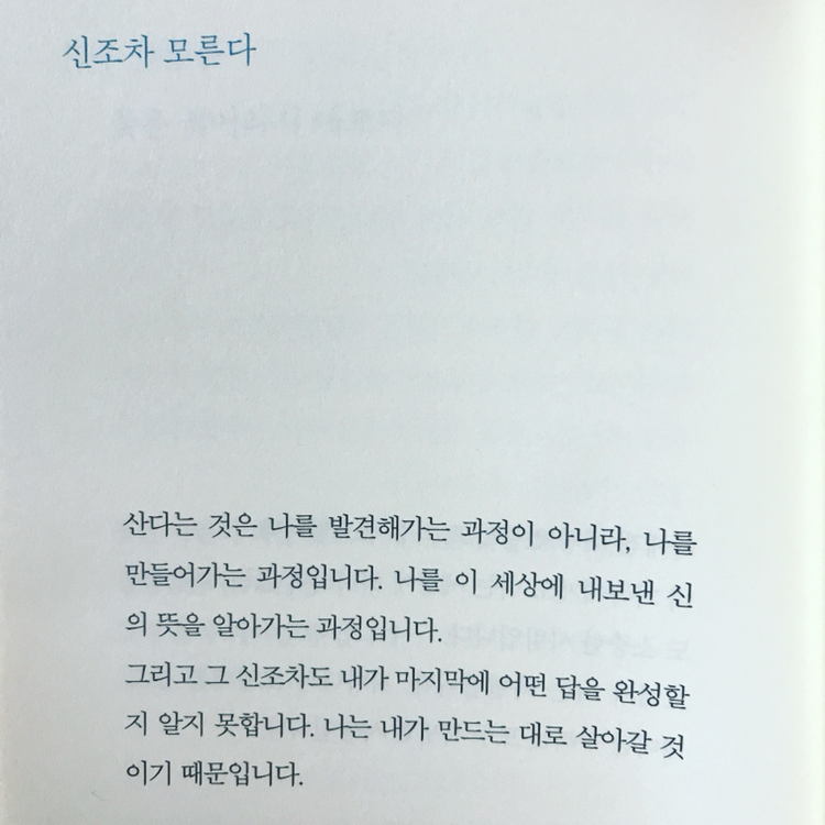 산다는 것은 나를 발견해가는 과정이 아니라, 나를 만들어가는 과정입니다. 나를 이 세상에 내보낸 신의 뜻을 알아가는 과정입니다. 그리고 그 신조차도 내가 마지막에 어떤 답을 완성할지 알지 못합니다. 나는 내가 만드는 대로 살아갈 것이기 때문입니다.