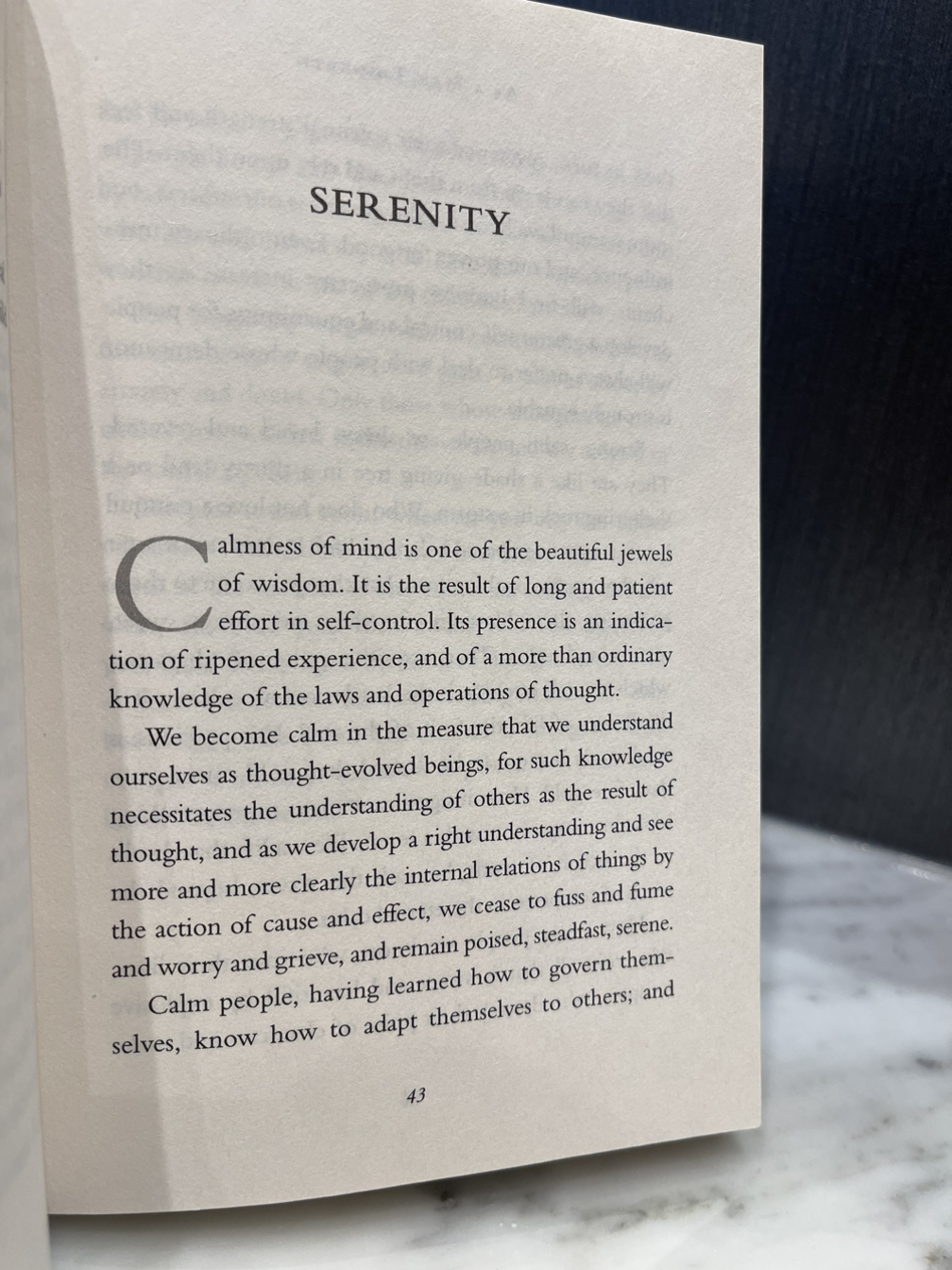 마음의 평온은 지혜의 아름다운 보석 중 하나입니다. 그것은 자기 통제를 위한 오랜 인내의 노력의 결과입니다. 평온함은 숙성된 경험이 드러난 것입니다. 그리고 생각의 법칙과 작동에 대한 평범한 지식 이상의 것을 나타냅니다.