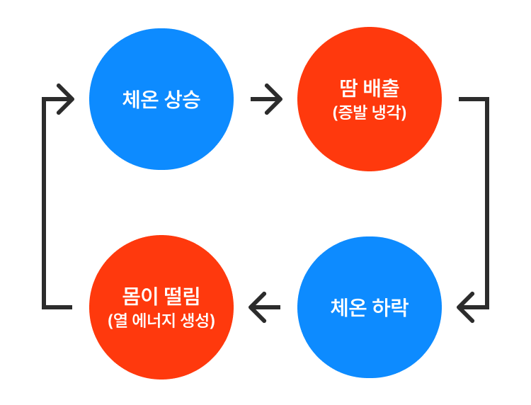 체온이 높아지면 우리 몸은 땀을 배출해내기 시작한다. 땀은 식으면서 증발 냉각 현상을 일으키고, 그렇게 체온을 낮추어 정상으로 유지시킨다.