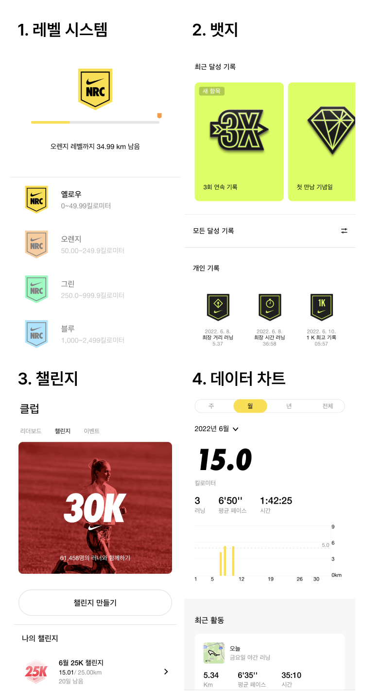 NRC는 운동을 마치자마자 피드백(달성 기록, 뱃지, 순위)을 제공한다(속도). 또한 데이터 차트를 통해 저번 주의 기록과 이번 주의 기록을 한눈에 비교할 수 있다(측정 가능성).