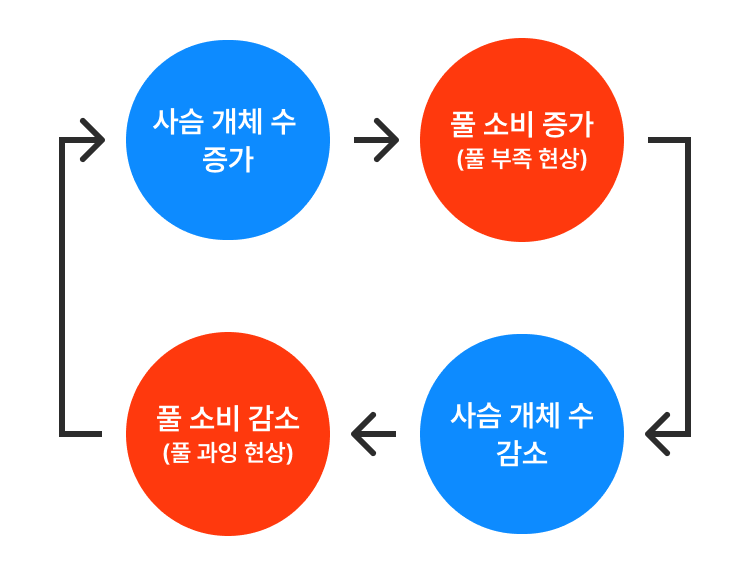 그러다가 늘어난 사슴의 개체 수에 비해, 전체 풀의 양이 부족한 상황이 다가온다. 그럼 먹이를 먹지 못한 사슴의 개체 수가 줄어들기 시작하고, 풀의 양은 다시 늘어난다. 그렇게 밸런스가 유지된다.