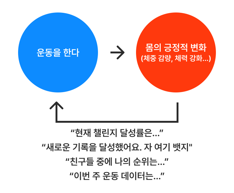 뱃지같은 피드백은 단순히 '앱 실행 횟수', '친구 10명 만들기' 같이 운동과 관련 없는 게 아니다. 모두 이때까지 내가 했던 운동과 관련이 있다(맥락). 또한 그 기저엔 건강한 신체에 대한 나의 욕구가 있다(동기).