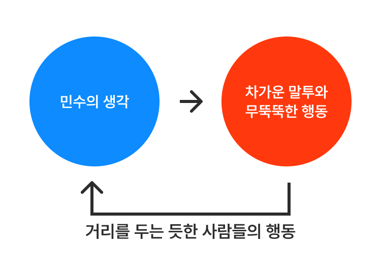 아무도 나를 좋아하지 않을 거라는 생각은 차가운 말투와 무뚝뚝한 행동으로 이어졌고, 그런 행동은 사람들이 민수로부터 거리를 두게 만들었으며, 그런 사람들의 행동을 보며 민수는 자신이 가졌던 생각이 맞았다고 더 굳게 믿게 되었다.